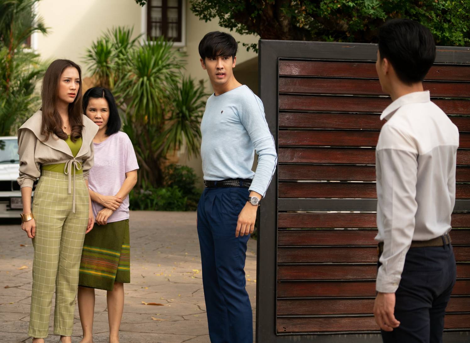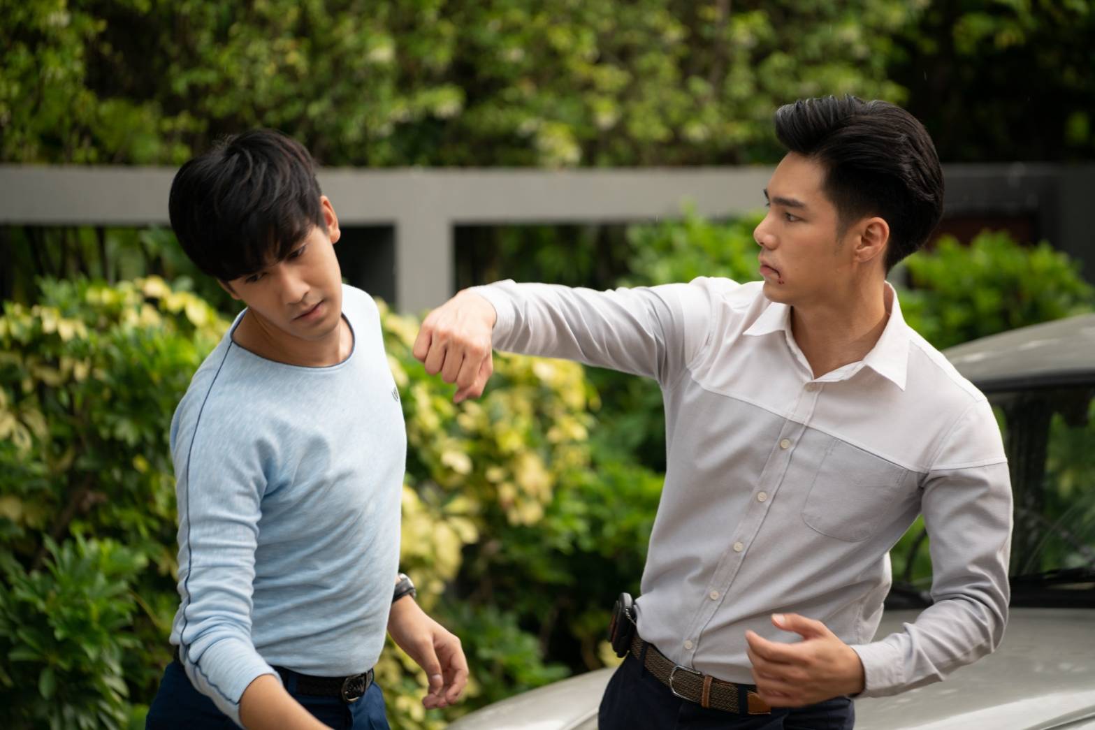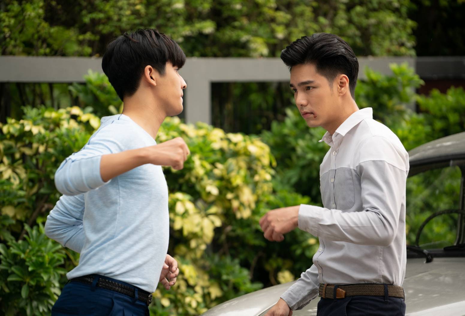 ผู้กำกับฯ เรียก 2 หนุ่มมาซ้อมคิวบู๊ก่อน ส่วน “แม็กกี้” ท่องบทรอสวยๆ แล้วก็เริ่มถ่ายจริง เปิดฉากที่ “โอ๊ต” มารับ “แม็กกี้” ไปทานข้าว ส่วน “บูม” ก็ยืนเก๊กหล่ออยู่หน้าบ้าน เรื่องส่งสายตาหน้ากวนไว้ใจ “บูม” แล้วก็ปะทะคารม จุดชนวนให้ “โอ๊ต” ระเบิดอารมณ์ เปิดฉาก ซัด “บูม” ก่อน ฝั่ง “บูม” ก็ซัดกลับไม่โกง ผู้กำกับฯปล่อยให้ทั้งคู่โชว์พลังกันพักหนึ่งก็ให้คิว “กอง” (รุ้งลาวัลย์ โทนะหงษา) พาคุณผู้หญิงออกมาห้ามศึกรัก แล้วไล่หนุ่มๆ กลับไป