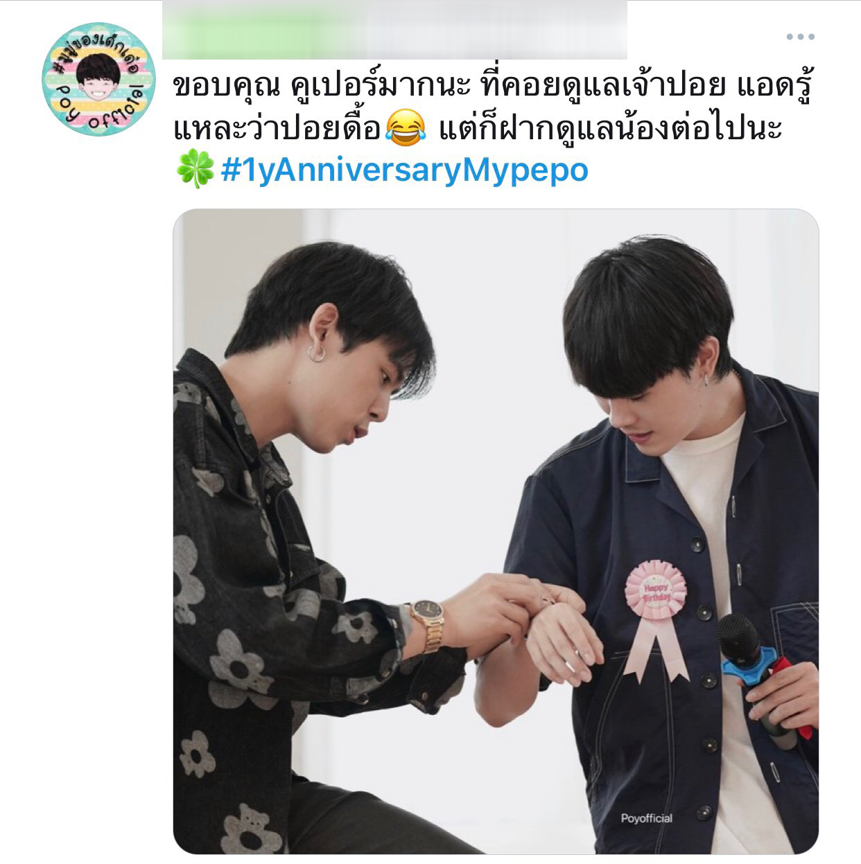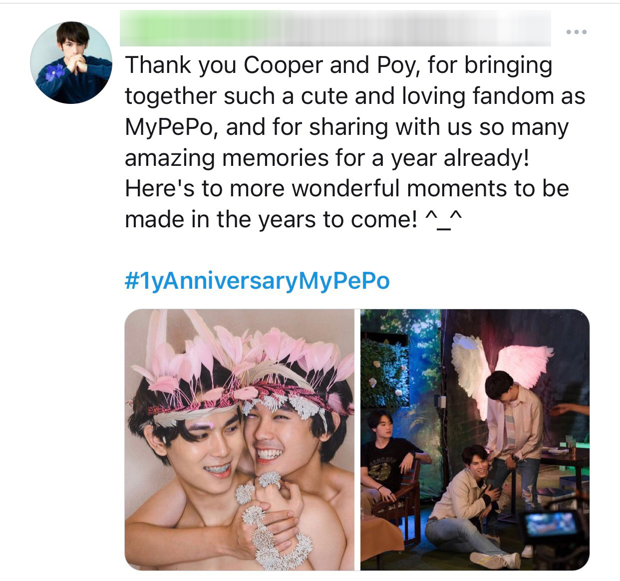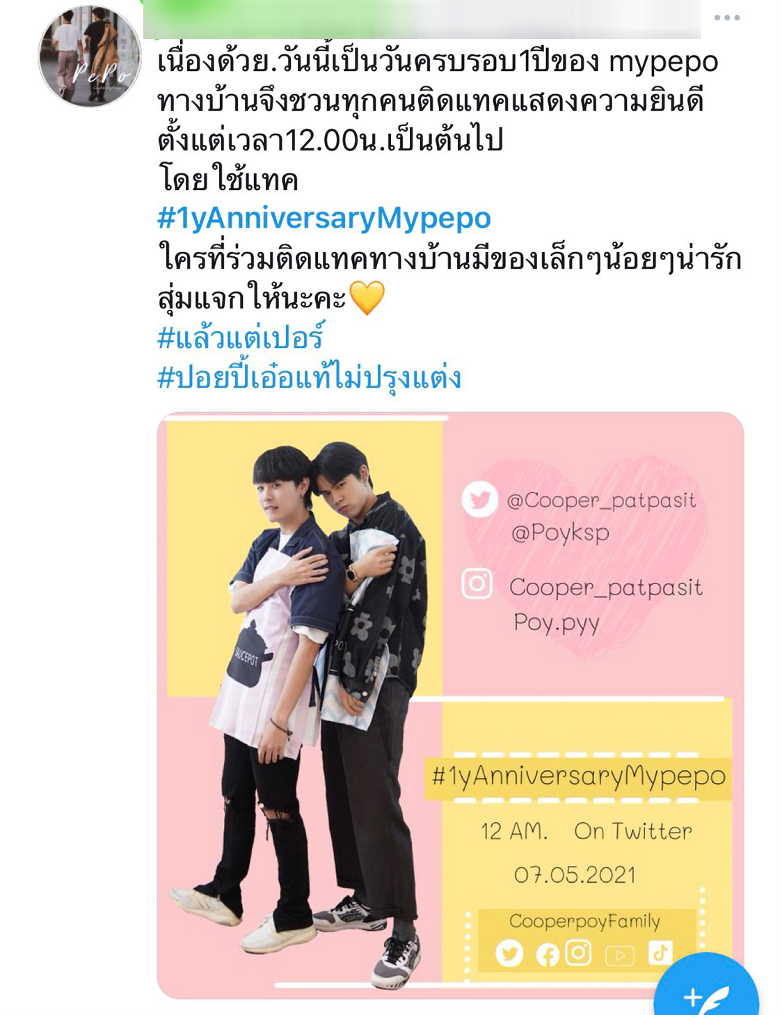 ล่าสุดวันนี้ 7 May ครบรอบ 1 ปี #mypepo ของแฟนคลับ คูเปอร์ปอย ที่ให้การสนับสนุนทุกผลงานของน้องๆ ซึ่งมีแฟนคลับส่งคำอวยพรมาให้มากมายพร้อม #1yAnniversaryMypepo งานนี้สองหนุ่ม คูเปอร์ปอย จึงทำคลิปขอบคุณแฟนๆ และเตรียมมีเซอร์ไพรส์ แต่จะเป็นอะไรต้องติดตาม…บอกได้คำเดียวว่า ห้ามพลาด!!!