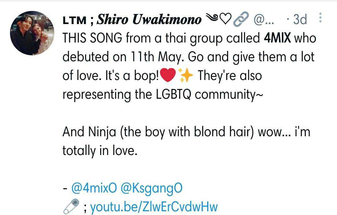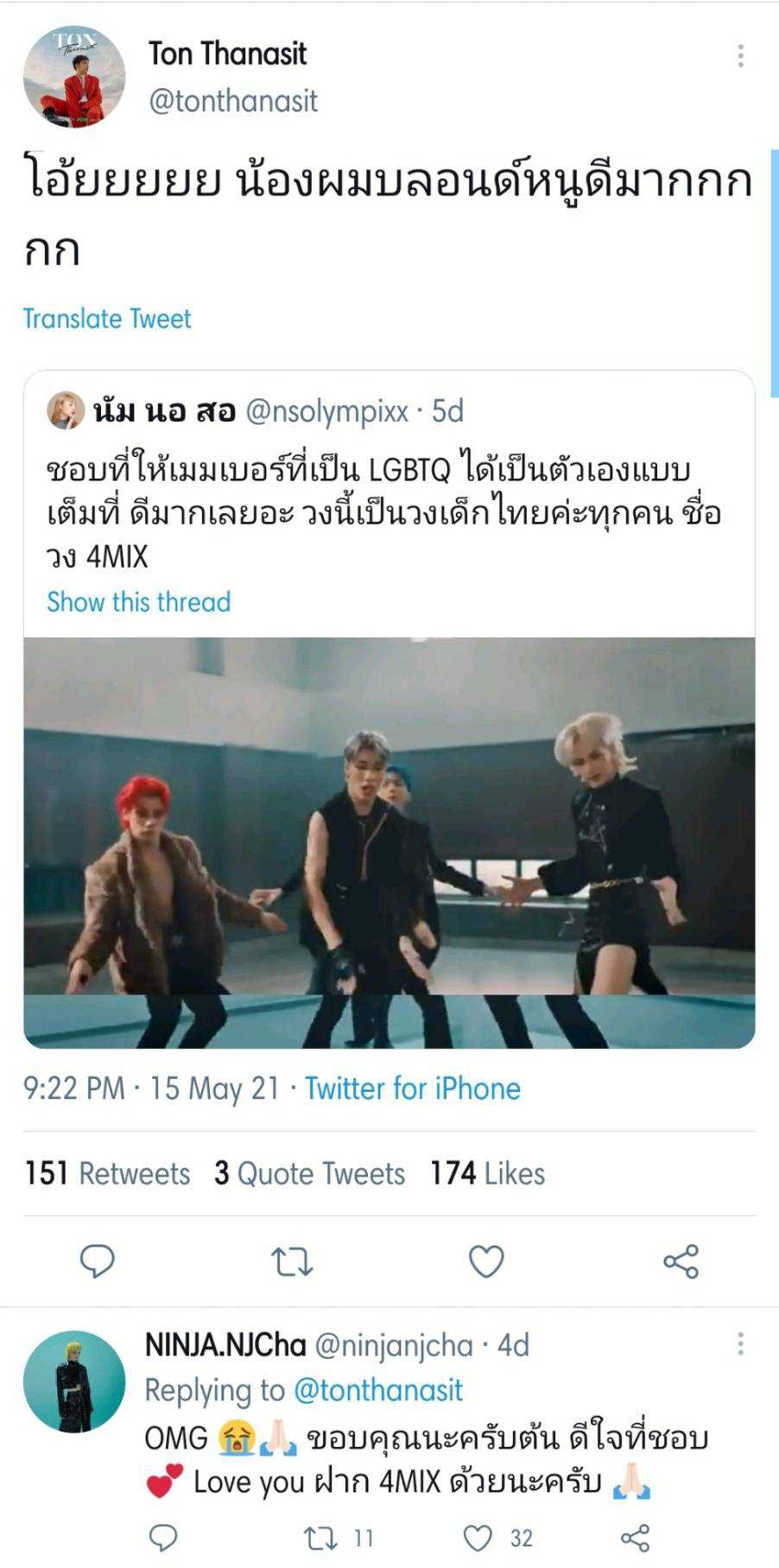 และสิ่งที่แฟนๆ ดูจะชื่นชมที่สุดก็คือ การเปิดตัวว่าเป็นวง Boy Band LGBTQ สนับสนุนให้ทุกคนกล้าที่จะเป็นตัวเอง และกล้าที่จะทำตามความฝัน โดยทิ้งข้อจำกัดทางเพศไป งานนี้ความสามารถของหนุ่มๆ 4MIX ก็เลยไปเข้าตาและโดนใจนักร้องรุ่นพี่ในวงการอย่าง ต้น ธนษิต ถึงกับทวิตชื่นชมในความสามารถของหนุ่มๆ ทั้ง 4 คนเลยทีเดียว เห็นแบบนี้ก็ปลื้มใจแทนวง 4MIX จริงๆ