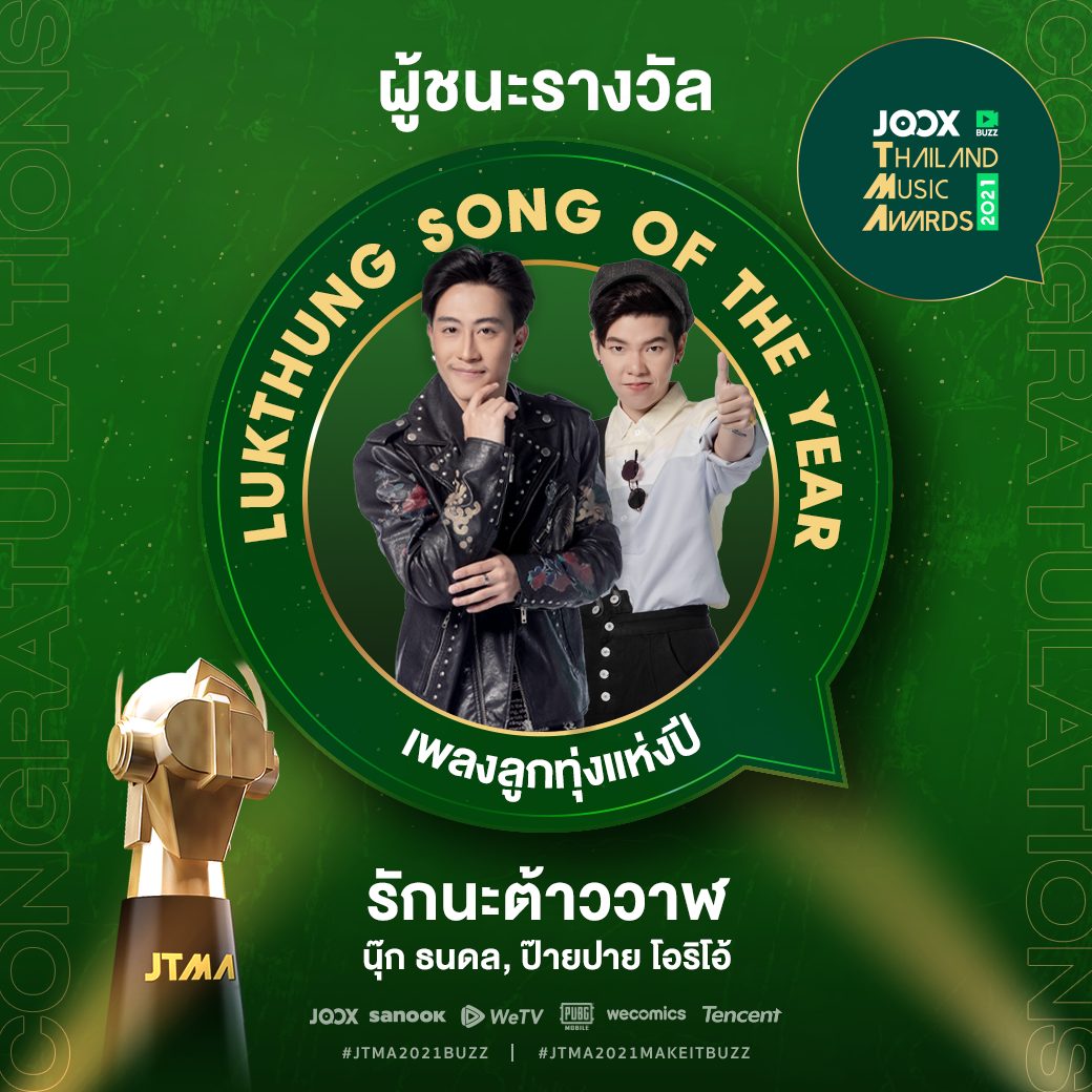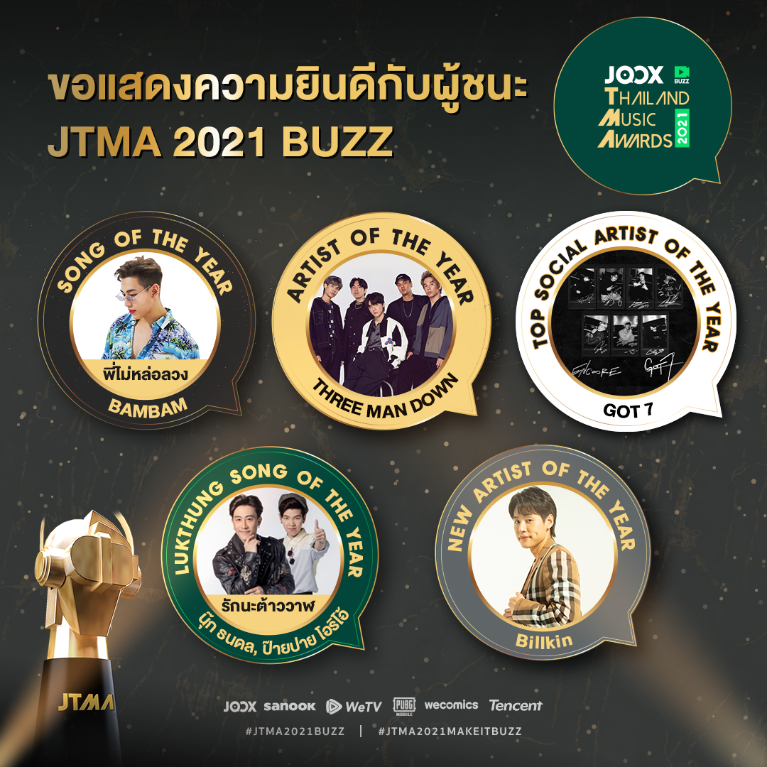 จบไปแล้ว สำหรับงานประกาศรางวัล JTMA2021 BUZZ หรือ JOOX Thailand Music Awards 2021 งานประกาศรางวัลทางดนตรีแห่งปีที่แฟนเพลงทั้งประเทศรอคอย โดยครั้งนี้มาในมิติใหม่ กับการประกาศผลรางวัลผ่านคลิปวิดีโอสั้น ‘JOOX BUZZ’ โดยรายชื่อศิลปินผู้ชนะรางวัลทั้ง 5 สาขา ได้ถูกประกาศอย่างเป็นทางการ ผ่านทาง JOOX มิวสิคแอปพลิเคชัน เมื่อวันที่ 28 พฤษภาคม ที่ผ่านมา