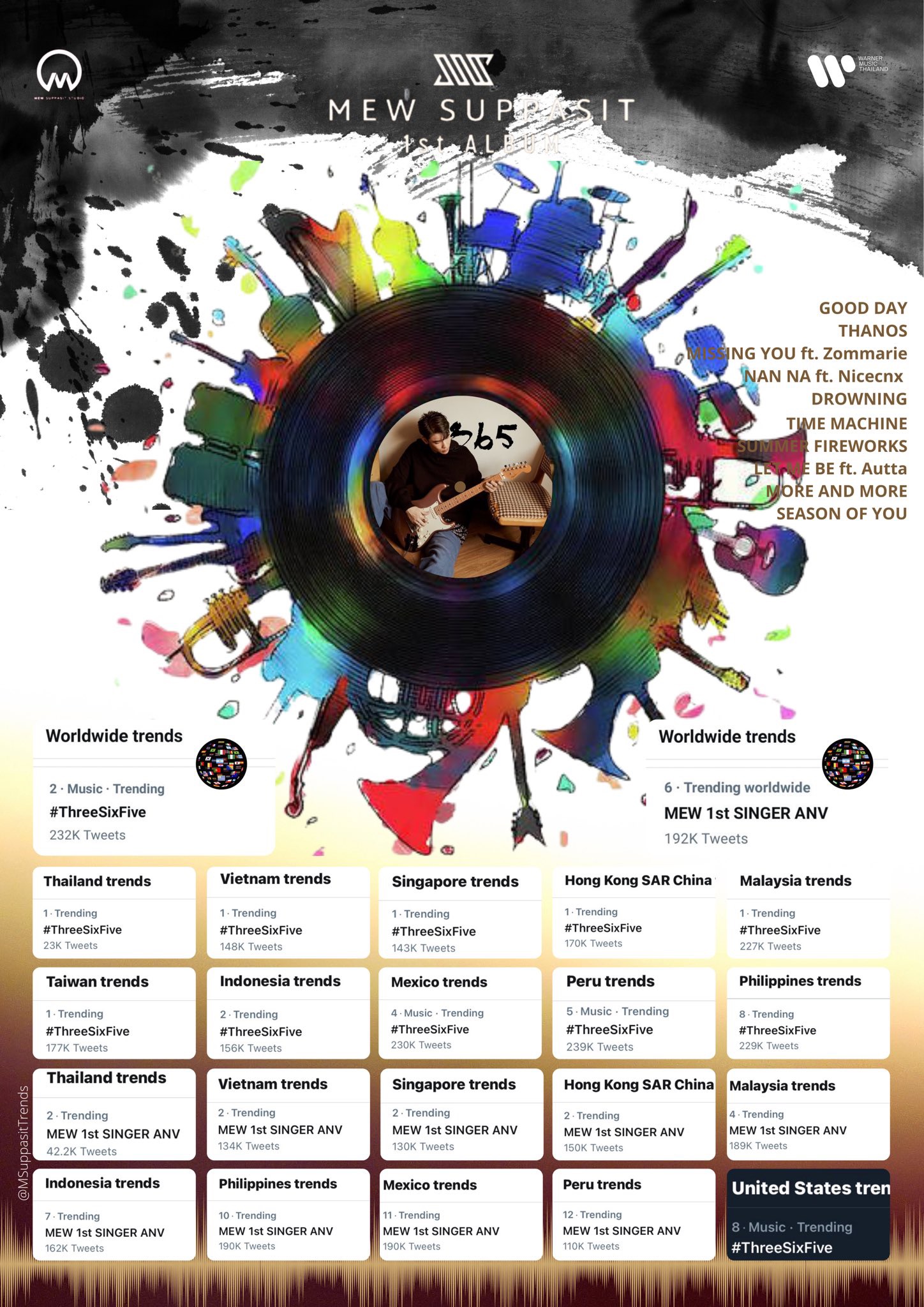 เรียกได้ว่ากระแสดีไม่มีตก สำหรับ มิว ศุภศิษฏ์ จงชีวีวัฒน์ ที่ไม่ว่าจะปล่อยเพลงใหม่ออกมากี่ครั้ง แฟนคลับทั่วโลกก็ไม่เคยทำให้ผิดหวัง เพราะกระแสตอบรับร้อนแรงทุกครั้ง ล่าสุดกับเพลง Drowning (ที่มีเธอ) ที่พรีเมียร์มิวสิควีดีโอวันเดียวกับวันเปิดตัวอัลบั้ม “365” (Three Six Five) อย่างเป็นทางการผ่านทุกแพลตฟอร์ม ก็เกิดกระแสร้อนแรงบนทวิตเตอร์ทันที เพราะทันทีที่ปล่อยอัลบั้ม #ThreeSixFive ก็ติดเทรนด์ทวิตเตอร์ Worldwide Trends ในอันดับที่ 2 และติด Thailand Trends ในอันดับที่ 1 และอีกหลายประเทศทั่วโลก แถมงานนี้ไม่ได้มาแค่แฮชแท็กเดียว แต่ยังมี Mew 1 SINGER ANV อีกหนึ่งแฮชแท็กที่เฉลิมฉลองครบรอบ 1 ปีของการเป็นนักร้องอย่างเต็มตัวของ มิว ศุภศิษฏ์