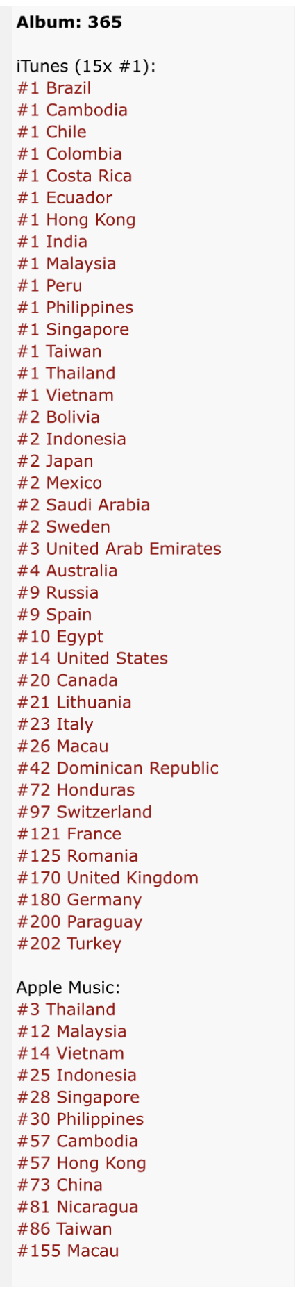 นับว่า 1 ปีที่ผ่านมาบนเส้นทางสายดนตรีของ มิว ศุภศิษฏ์ ก็สามารถพิสูจน์ฝีมือการเป็นนักร้องอย่างเต็มตัวได้เป็นอย่างดี ผ่านผลงาน อัลบั้ม “365” (Three Six Five) แถมยังเป็นผลงานอัลบั้มแรกที่น่าจดจำ เพราะสามารถขึ้นสู่ iTunes Chart อันดับ1 ได้ถึง 15 ประเทศทั่วโลก แถมยังสามารถขึ้นถึงอันดับ 2 ของประเทศญี่ปุ่น และอันดับ 14 ของสหรัฐอเมริกา ซึ่งถือว่าหินมากทีเดียว ที่จะมีศิลปินต่างชาติทะลุชาร์ตเข้าไปได้สูงขนาดนี้ เรียกได้ว่าเส้นทางสายดนตรีของ มิว ศุภศิษฏ์ สวยงามและไปได้อีกยาวไกลอย่างแน่นอน