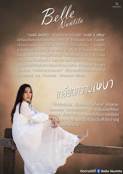 เบลล์ นันทิตา หรืออีกฉายาหนึ่งคือ “เบลล์ 2 เสียง” นักร้องที่เคยเซอร์ไพรส์คนดูจากเวที Thailand Got Talent เจ้าของเพลงเสียงที่เปลี่ยน ที่เคยติดอันดับ 1 ของทุกชาร์ตทั่วประเทศด้วย 2 เสียง 2 สไตล์ ที่เป็นเอกลักษณ์ ทั้งเสียงแบบชายหนุ่มที่มีเสน่ห์ และเสียงหญิงสาว หวานใส ทำให้เธอเป็นที่น่าสนใจ และกลายเป็นศิลปินที่ทุกคนรู้จัก วันนี้เธอได้ตัดสินใจกลับมาร่วมงานกับค่าย Khaosan Beats พร้อมส่งอินเนอร์เต็มแม็กซ์ ในเพลง เกลียดความเหงา