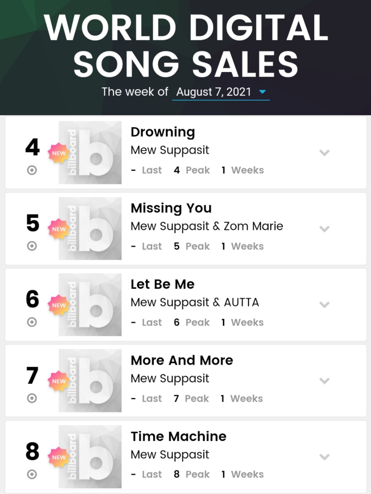 สำหรับ Billboard Charts ที่เพลงทั้ง 5 เพลงของ มิว ศุภศิษฏ์ ติดอันดับ Top10 นั้น จะเป็นชาร์ต World Digital Song Sales Chart ชาร์ตรวมยอดขายเพลงทางช่องทางดิจิตอล ซึ่งเพลง Drowning ขึ้นสูงถึงอันดับที่ 4 ในชาร์ตนี้ ตามมาด้วยเพลง Missing You Feat.ส้ม มารี อันดับที่ 5, Let Me Be Feat.Autta อันดับที่ 6, More And More อันดับที่ 7 และ Time Machine อันดับที่ 8 เรียกได้ว่าเพลงใหม่ทั้งหมดในอัลบั้มนี้สามารถเข้าสู่ชาร์ต Top10 ได้ทั้งหมด แถมยังครองชาร์ตถึง 5 เพลงด้วยกัน เรียกได้ว่าการติดชาร์ตแบบนี้ไม่ธรรมดาจริงๆ แสดงให้เห็นถึงฐานแฟนคลับของ มิว ศุภศิษฏ์ ที่มีอยู่ทั่วโลก และพร้อมที่จะสนับสนุนผลงานเพลงของ มิว ศุภศิษฏ์ อย่างเหนียวแน่น