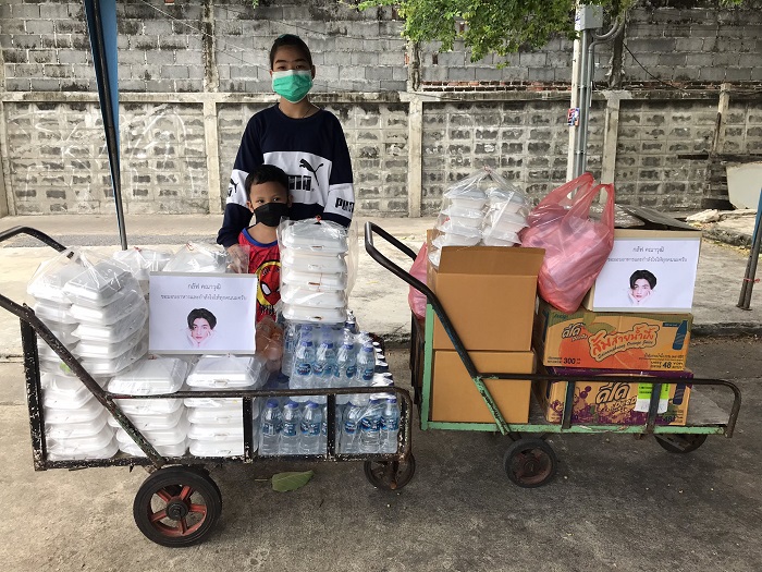 “ความตั้งใจในครั้งนี้คืออยากที่จะทำให้ได้วันละประมาณ 200 กล่องต่อชุมชน โดยตลอดทั้งเดือนสิงหาคมนี้เลยครับ ผมตั้งใจด้วยตัวเอง โดยทางแม่และทีมงานได้มีการซื้อวัตถุดิบจากพี่ๆ พ่อค้าแม่ค้าที่ตอนนี้พวกพี่เขาก็ค่อนข้างลำบากขายของไม่ค่อยได้ ซึ่งผมและครอบครัว รวมถึงพี่ๆ ทีมงานได้ลงมือบรรจุ ใส่ใจรายละเอียดทุกกล่องทุกขั้นตอน โดยทุกคนจะเน้นเรื่องความสะอาดและปลอดภัยเป็นอย่างมาก จะมีการใส่อุปกรณ์ป้องกัน ทั้งหน้ากากอนามัย ชุดกันเปื้อน เฟสชิลด์ และถุงมือแพทย์สำหรับการหยิบจับหรือสัมผัสภาชนะก่อนบรรจุสำหรับนำไปส่งมอบให้กับทุกคน โดยมีการแจกไปแล้วให้กับชุมชน ประชาอุทิศ 28 เขตทุ่งครุ และ ชุมชนมาตานุสรณ์ ส่วนชุมชนและแคมป์คนอื่นๆ จะได้มีการนำไปแจกให้ในครั้งต่อ ๆ ไปครับ ทางผมและครอบครัวหวังว่ากำลังใจเล็ก ๆ ที่พวกเราทุกคนส่งมอบในครั้งนี้จะเป็นเพิ่มกำลังใจให้กับทุกคน สู้ต่อไป เพื่อวันพรุ่งนี้ สู้ ๆ นะครับ กลัฟเป็นกำลังใจให้เสมอ”