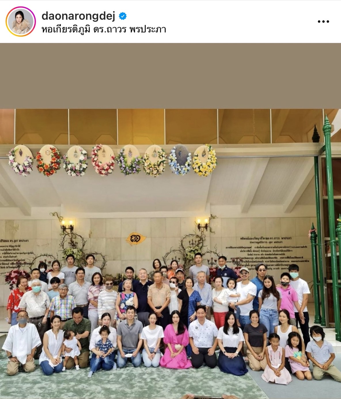 นับเป็นเรื่องราวดีๆ กับภาพความประทับใจของแฟนๆ “ดาว พอฤทัย ณรงค์เดช (บุณยะจินดา)” ที่ล่าสุดเจ้าตัวได้โพสต์ภาพขณะไปร่วมพิธีทำบุญ เนื่องจากเป็นวันคล้ายวันถึงแก่กรรมของท่านประธานฯ ดร.ถาวร พรประภา และ ท่านรองฯ ดร.อุษา พรประภา ณ ศาลากตัญญู สวนพฤกษชาติ พัทยา พร้อมญาติผู้ใหญ่ทางฝากฝั่งสามีของ “ณพ ณรงค์เดช” กันอย่างชื่นมื่น ซึ่งบรรยากาศเต็มไปด้วยรอยยิ้มสุดอบอุ่นท่ามกลางเครือญาติฝั่งพรประภา พร้อมแคปชั่นว่า “Family Day” และความอบอุ่นในครั้งนี้ “ดาว พอฤทัย ณรงค์เดช (บุณยะจินดา)” ได้โพสต์คลิปวิดีโอพร้อมข้อความว่า “ร่วมทำบุญประจำปีให้กับคุณตา & คุณยาย ของพี่ณพค่ะ #ครอบครัวพรประภา @nnarongdej” อีกด้วย