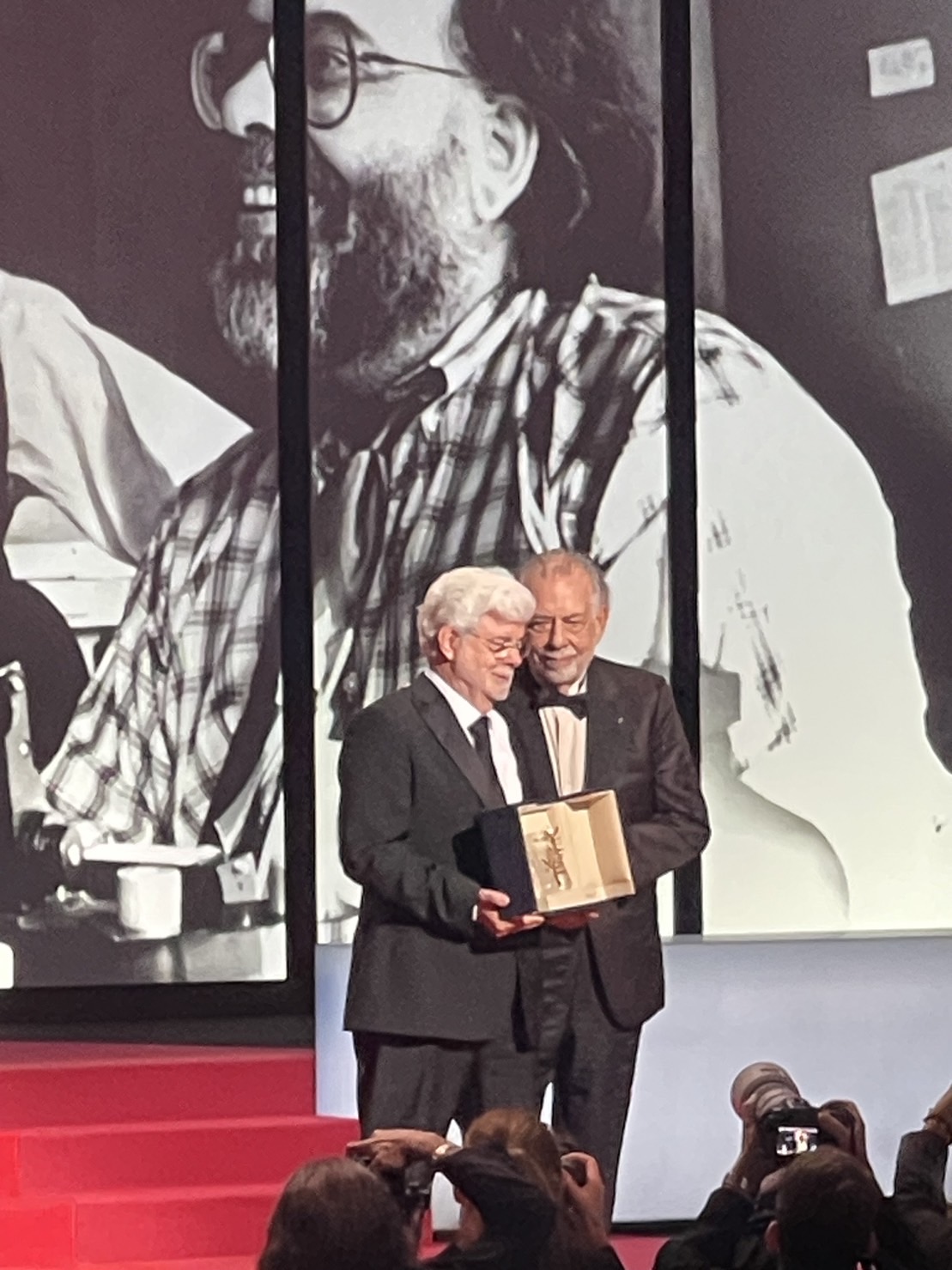 “มีอีกช่วงสำคัญคือ จอร์จ ลูคัส ผู้กำกับตัวพ่อ ได้รับรางวัลเกียรติยศ Plame d’or d’honeur ( Honorary Palme d’or ) มอบโดยสุดยอดผู้กำกับรุ่นเก๋า ฟรานซิส ฟอร์ด คอปโปล่า คู่ควรมากจริงๆ คะ กับรางวัลนี้เพราะมีผลงานหนังดังๆ หลายเรื่องหลายปีมายาวนาน”