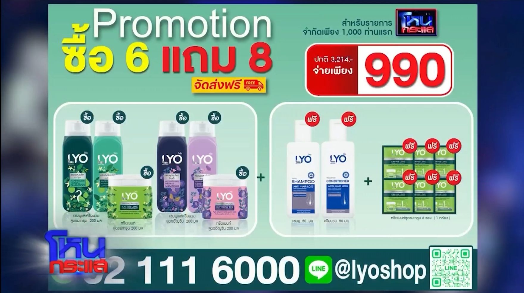 วันนี้แจกแชมพูไลโอสมุนไพร มีทั้งอัญชันและมะกรูด ชุดนึง 3 อย่าง แชมพู ครีมนวด ทรีทเม้นท์ แต่ถ้าใครไม่ได้ ก็สั่งซื้อได้ เรามีโปรโมชั่นมาให้ วันนี้ให้ 1,000 เซ็ตเลย ซื้อ 6 แถม 8 ซื้อแชมพูไลโอสมุนไพร ทั้งหมด 2 เซ็ต รวม 6 ชิ้น แถมฟรีแชมพูครีมนวดไลโอสูตรดั้งเดิม แถมเพิ่มทรีทเม้นท์สูตรมะกรูดให้อีก 6 ซอง รวมแล้วจากปกติ 3,214 บาท คุณไม่ต้องจ่ายนะ วันนี้จ่าย 990 บาทพอเลย ได้ไปจุกๆ แบบนี้ โทรด่วนตอนนี้ 02-1116000 หรือไลน์ @lyoshop ส่งให้ฟรีเลย เซเว่นหรือตัวแทนจำหน่ายทั่วๆ ไปก็ได้ แต่ถ้าซื้อตอนนี้คุณกำไรมากกว่า วันนี้ที่ให้อาจารย์มา อยากให้เห็นว่ามะกรูดกับอัญชันมีคุณสมบัติยังไง ทั้งหมดถูกแปลเป็นไลโอสูตรสมุนไพร จะนั่งหามะกรูดมาหมกไฟถูหัวอาจไม่ทัน คุณซื้อเลย แชมพูไลโอ ทั้งอัญชันและมะกรูด มันก็ช่วยได้หลายอย่าง แพทย์แผนไทยเป็นเรื่องที่ดี แต่อาจเสียเวลาในการทำ แต่ถ้าแผนเร่งรัดต้องไลโอ?