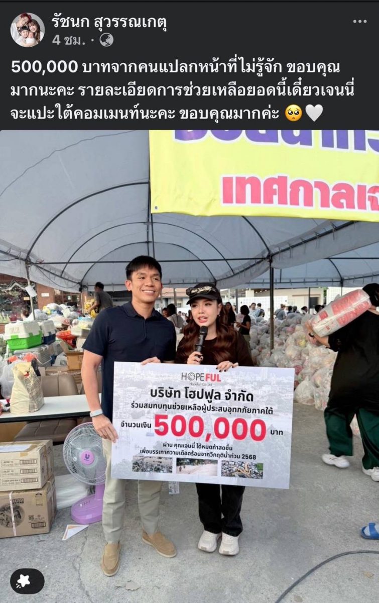 ช่วงค่ำวันนี้ เกิดกระแสในโลกออนไลน์หลังมีภาพชายหนุ่มผู้ไม่เปิดเผยตัวมาก่อน เดินทางเข้ามามอบเงินจำนวน 500,000 บาท ให้กับ เจนนี่ ได้หมดถ้าสดชื่น ซึ่งทำหน้าที่เป็น สะพานบุญอยู่ที่จุดช่วยเหลือ สายไหม 73 เพื่อรวบรวมสิ่งของและเงินบริจาคช่วยเหลือผู้ประสบภัยน้ำท่วมภาคใต้ 2568