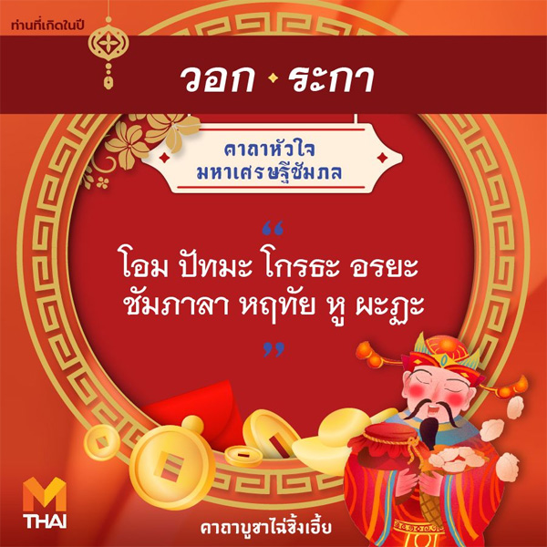ทั้งนี้ MThai ได้นำคาถาบูชาไฉ่ซิ้งเอี๊ย สำหรับท่านที่เกิดปีต่าง ๆ ทั้ง 12 นักษัตร ถือเป็นหัวใจคาถาของทิเบตจารึก ในภาษาสันสกฤตมาแต่ครั้งโบราณมาฝากกัน โดยให้ตั้งจิตให้สงบระลึกถึงความดี และบุญกุศลที่ได้ประกอบมา แล้วท่องคาถาหัวใจมหาเศรษฐีชัมภล อธิษฐานขอพรจากท่าน