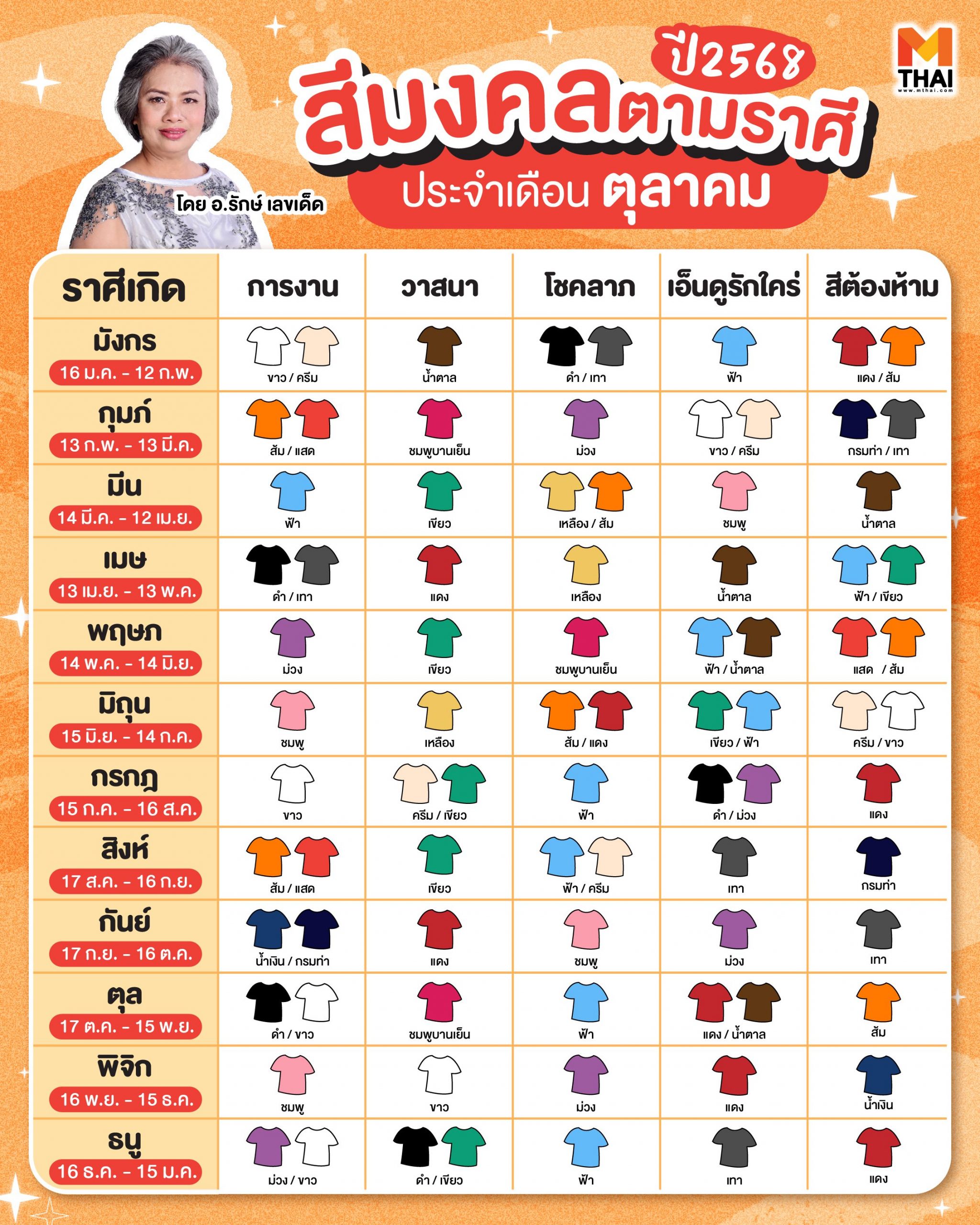 ตาราง สีมงคล 2568 ตามราศีประจำเดือนตุลาคมโดย อ.รักษ์ เลขเด็ด ที่ต่อแต่นี้ก้าวออกจากบ้านแต่ละทีชีวิตจะไม่มีสะดุด แต่งให้ตรงวัน ตรงกิจวัตรและความต้องการ ด้วยตารางสีมงคลตามนี้ค่ะ