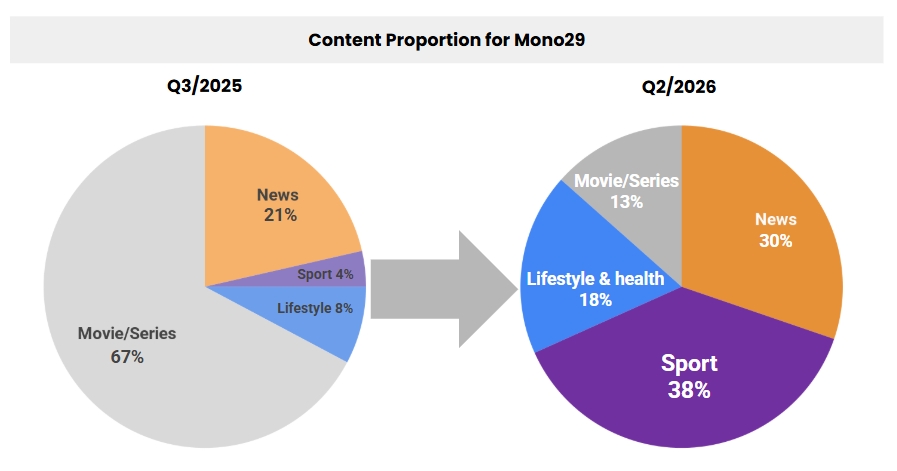 MONO29 จะปรับผังครั้งใหญ่ในเดือนพฤศจิกายน 2568 เป็นต้นไป เพิ่มสัดส่วน Sport Content จาก 4% เป็น 38% โดยครอบคลุมสิทธิ์การถ่ายทอดสดและรายการกีฬาระดับโลก