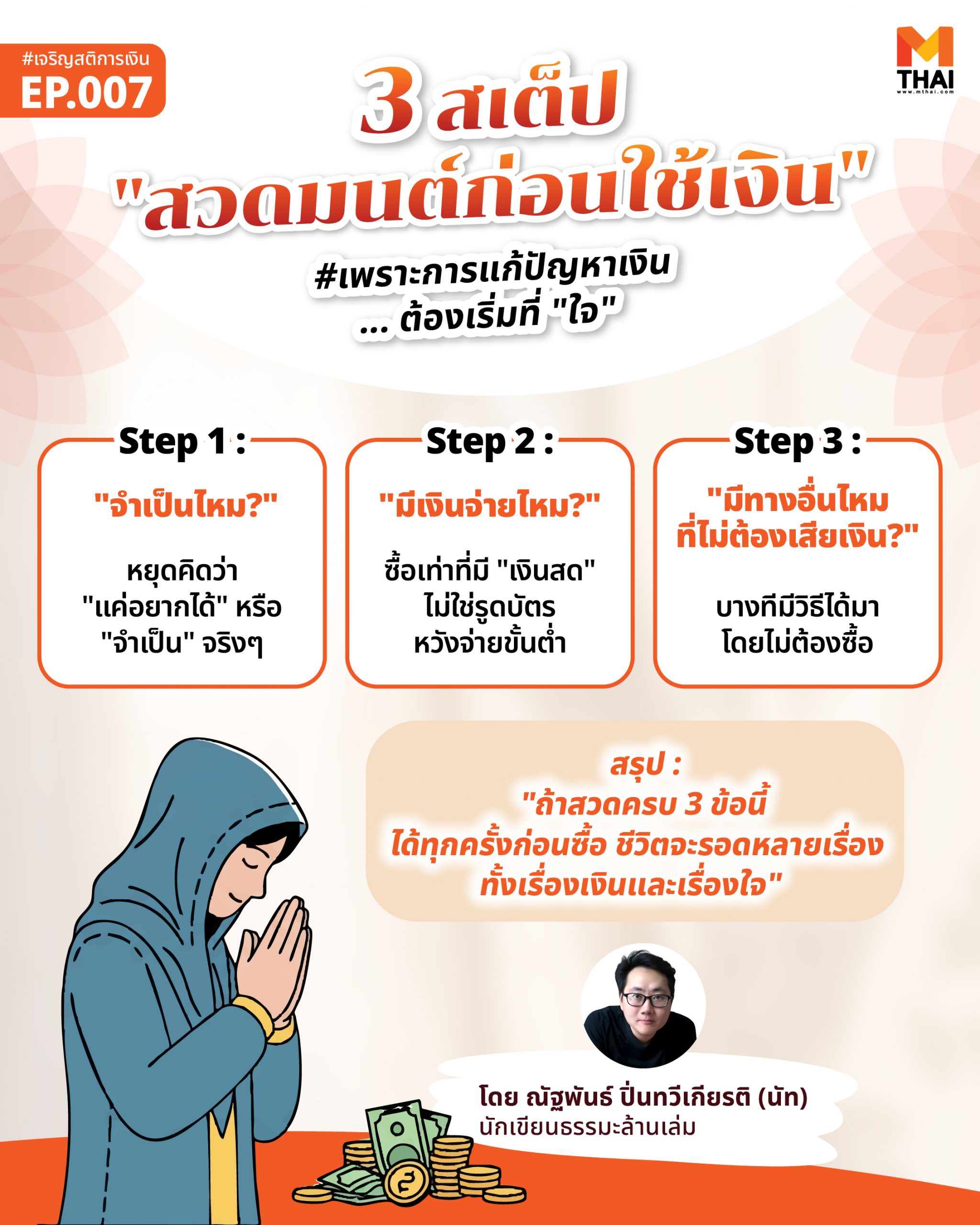 ธรรมะที่ใช้ : "สันโดษ" = พอใจในสิ่งที่มี ไม่ดิ้นรนเกินตัวก่อนซื้อ ลองดูบัญชีในมือ "เรามีเงินพอจ่ายจริงไหม?" ไม่ใช่พอไม่มีเงินสด ก็ไปรูดบัตรแล้วหวังผ่อนจ่ายขั้นต่ำ