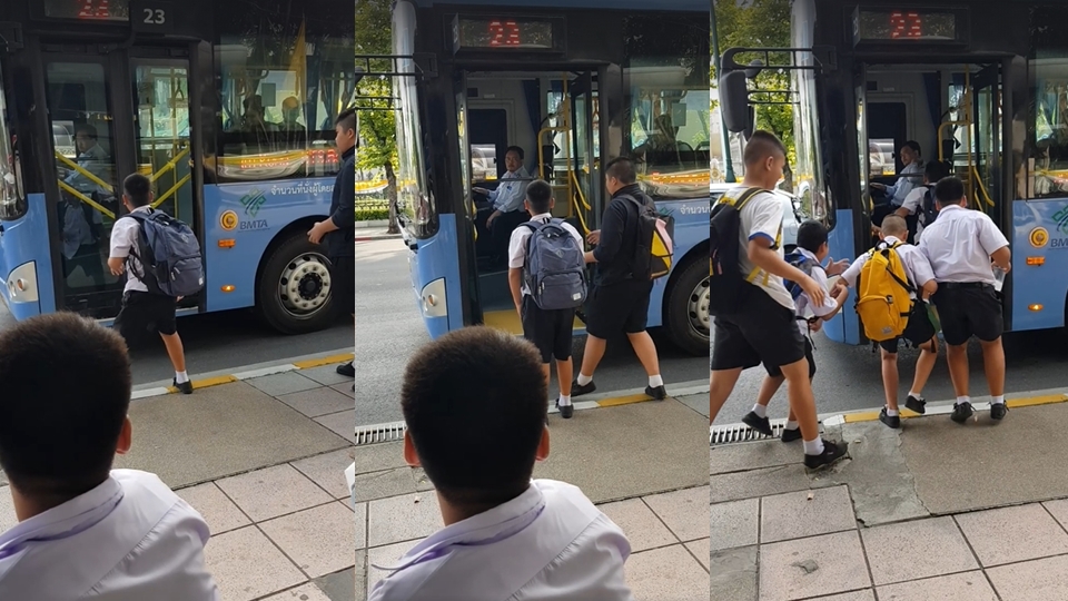 ซึ่งทางลุงคนขับรถเมล์ก็พยักหน้าว่า “มาๆ” เด็กนักเรียนชายก็ยกมือไหว้พร้อมกล่าวคำ “ขอบคุณครับ” ภายหลังลุงคนขับรถเมล์อนุญาตให้ขึ้น เพื่อนๆ ของนักเรียนชายที่นั่งอยู่ ก็พากันวิ่งขึ้นรถตามเพื่อนตัวเองทันที