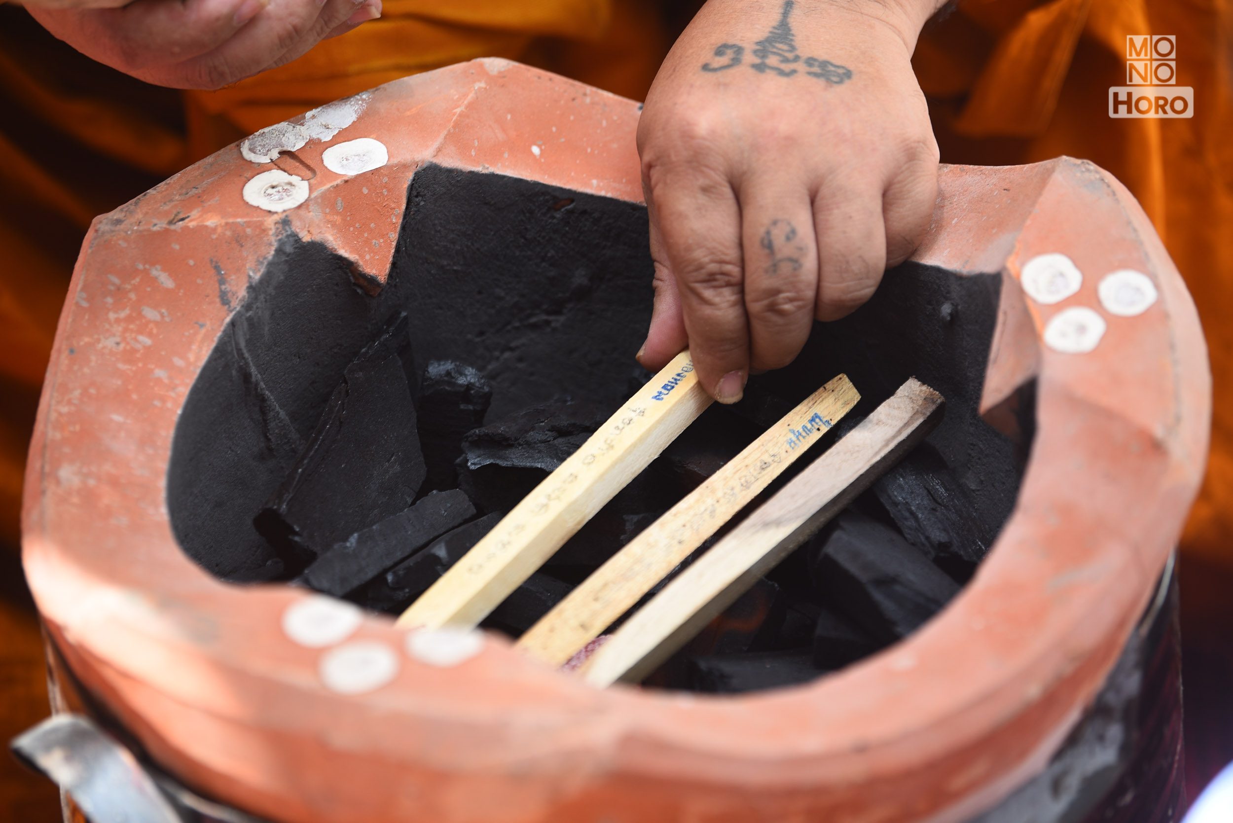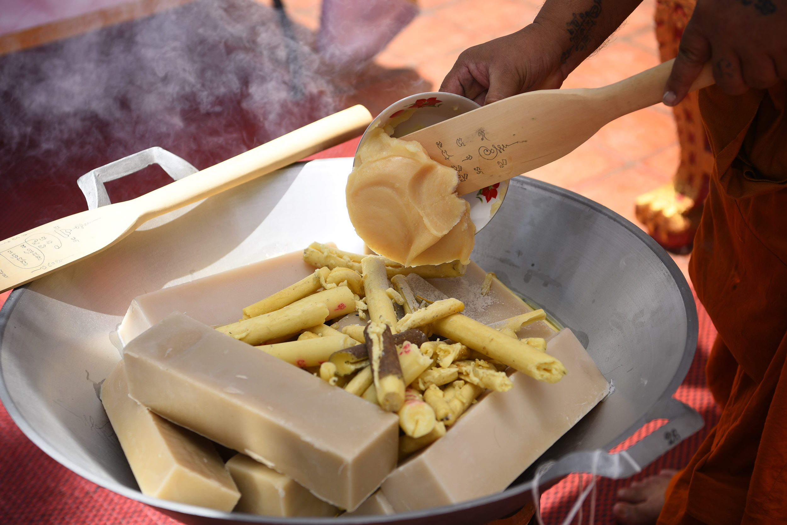 โดยมีเตา กระทะใบบัวและไม้พายลงยันต์ จุดเตาไฟด้วยไม้มงคล 9 ชนิด พร้อมด้วยการภาวนาคาถากำกับ เช่น ไม้ราชพฤกษ์ ไม้ชัยพฤกษ์ ไม้ไผ่สีสุก ไม้ขนุน เป็นต้น พร้อมตั้งกะทะใส่ขี้ผึ้งบริสุทธิ์ ผงลบจากพระครูปลัดสราวุธ ปัญญาวุธโธ (พระครูปืน) น้ำมันมงคล สีผึ้งจากครูบาอาจารย์ ผงว่านทางเสน่ห์เมตตา มวลสารสำคัญต่างๆ ลงในกระทะตามลำดับ