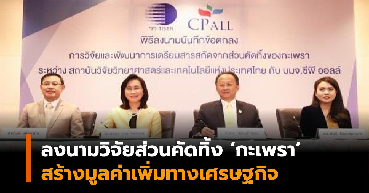 สถาบันวิจัยวิทยาศาสตร์และเทคโนโลยีแห่งประเทศไทย (วว.) กระทรวงการอุดมศึกษา วิทยาศาสตร์ วิจัย และนวัตกรรม (อว.) ร่วมกับ ซีพี ออลล์ ลงนามความร่วมมือ การวิจัยและพัฒนาการเตรียมสารสกัดจากส่วนคัดทิ้งของกะเพรา (ดอก กิ่ง ก้าน และลำต้น) จากโรงงานผลิตอาหารพร้อมรับประทานและการศึกษาฤทธิ์ลดไขมัน ปกป้องเซลล์ตับ ฆ่าเซลล์มะเร็ง