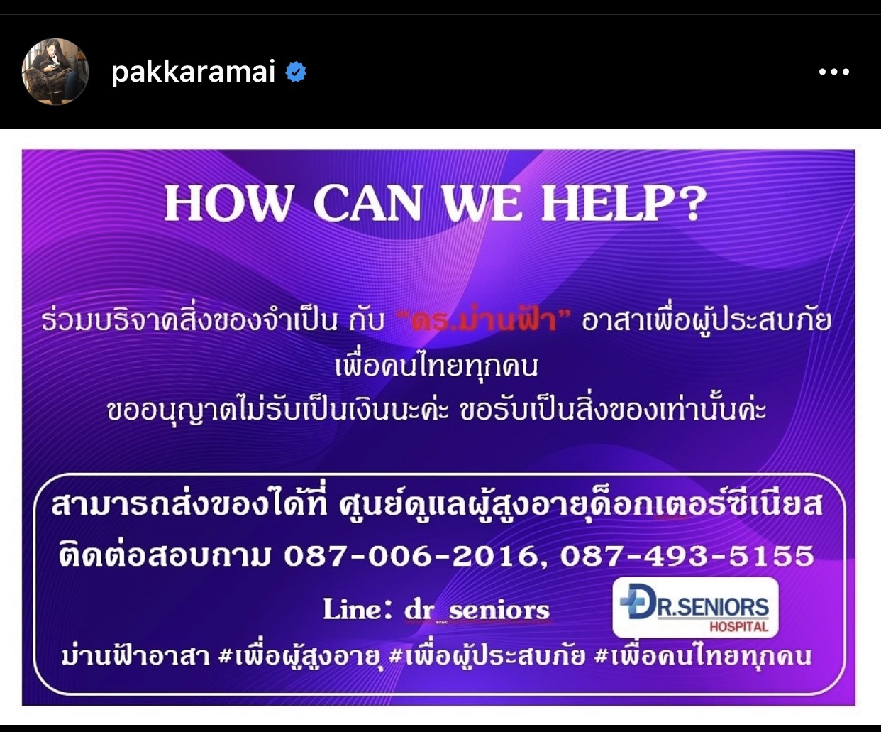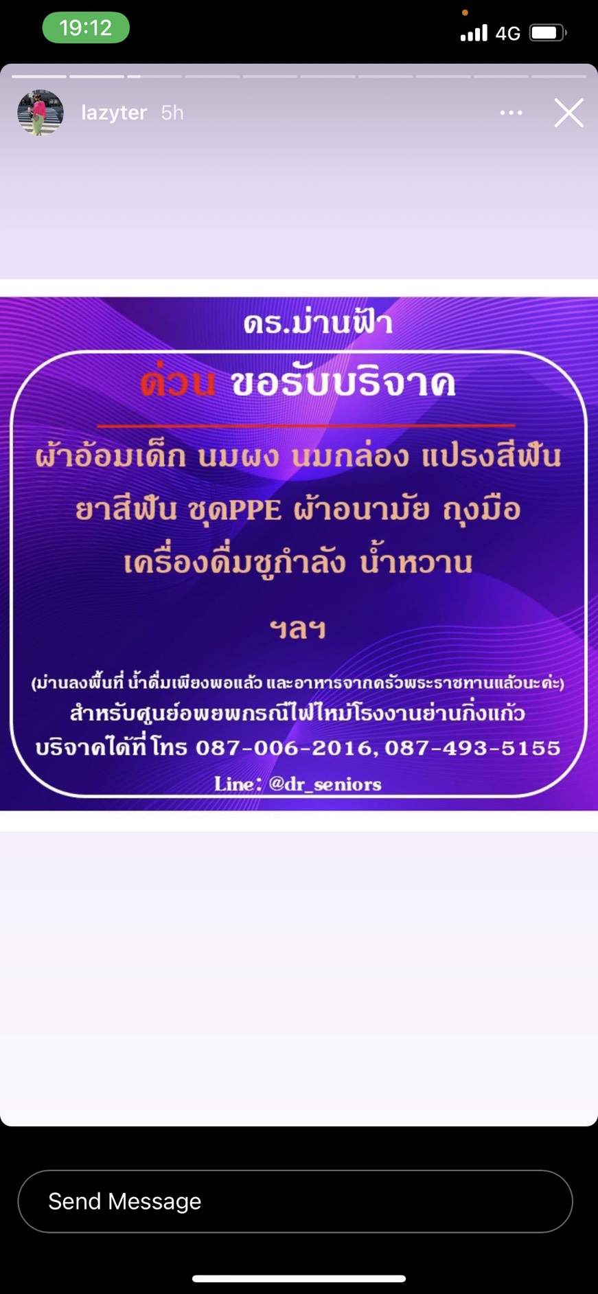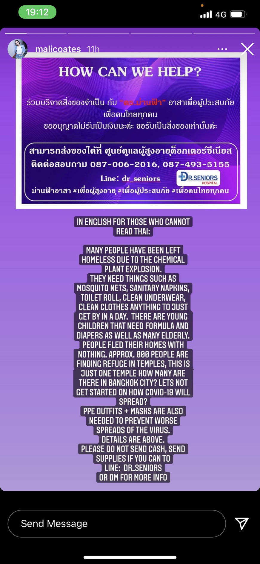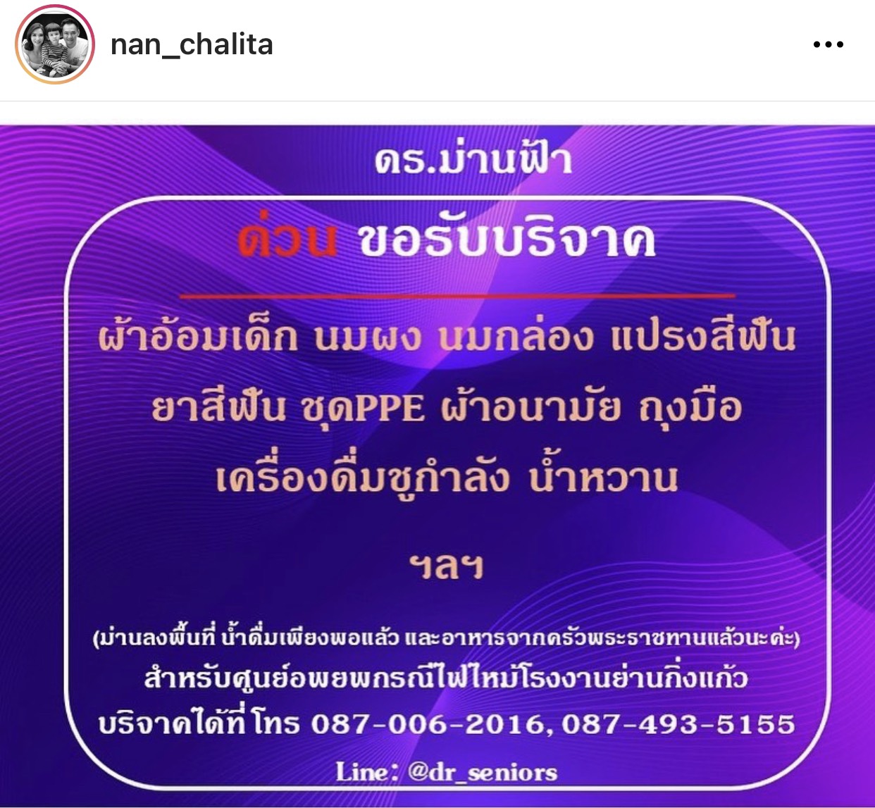 ทั้งนี้เหล่าคนบันเทิงอาทิ ธงธง มกจ๊ก, โบว์ เบญจศิริ, แนน ชลิตา, อั้ม ถิร ชุติกุล, มะลิ มาลินี โคทส์, อุ้ม ลัขณา, เอ็ม บุษราคัม, เอมี่ กลิ่นประทุม, แหม่ม วิชุดา, ตอง ภัครมัย, น็อต วรฤทธิ์, เก๋ ชลฃดา,ไอซ์ ณพัชรินทร์ ฯลฯ ยังร่วมมือร่วมใจโพสต์อินสตาแกรมส่วนตัวเพื่อบอกบุญแก่ผู้ที่อยากร่วมช่วยเหลือในการบริจาคผ้าอ้อมเด็ก นมผง นมกล่อง แปรงสีฟัน ยาสีฟัน ชุดPPE ถุงมือ ฯลฯ สำหรับศูนย์อพยพเหตุการณ์ไฟไหม้โรงงานย่านกิ่งแก้วอีกด้วย