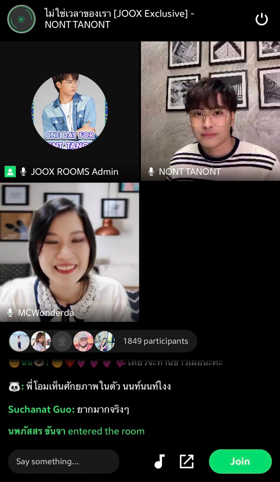 ช่วงท้าย นนท์ ได้เผยความในใจที่มีต่อแฟน ๆ ว่า “ดีมากเลยครับ ที่วันนี้มีโอกาสได้คุยกับแฟน ๆ นนท์ตอบทุกคำถามตามความรู้สึกเลย ถ้ามีโอกาสได้มา JOOX ROOMS ครั้งต่อไป นนท์อยากคุยกับทุกคนให้ได้มากกว่านี้ ในช่วงเวลาแบบนี้ที่เราไม่ได้เจอกัน ในทางกายภาพเราอาจจะต้องไกล แต่ทางโซเชียลฯ เราต้องใกล้กันมากกว่าเดิมครับ ผมทำงานตรงนี้ ทุกคนซับพอร์ทผม ผมก็อยากซับพอร์ททุกคนเท่าที่ทำได้ อาจจะไม่ครบถ้วน แต่ก็จะทำให้ดีที่สุดเท่าที่เราจะทำได้ ช่วงนี่เราไม่ได้เจอกัน ก็มาเจอกันในนี้แหละ ให้ได้หายคิดถึงกันบ้าง ดีที่เห็นแฟนๆ ทุกคนปลอดภัย สถานการณ์ตอนนี้น่าห่วง อยากจะให้ทุกคนดูแลตัวเองดีดี จะได้ไม่เป็นแบบนนท์ ผู้มีประสบการณ์ตรง ที่ใช้เวลารักษาตัวถึง 14 วัน คิดถึงทุกๆ คนมาก เป็นห่วงมาก อยากให้ทุกคนดูแลสุขภาพ อย่าลืมดูแลหัวใจตัวเองให้ดี ในช่วงที่หม่นๆ แบบนี้”