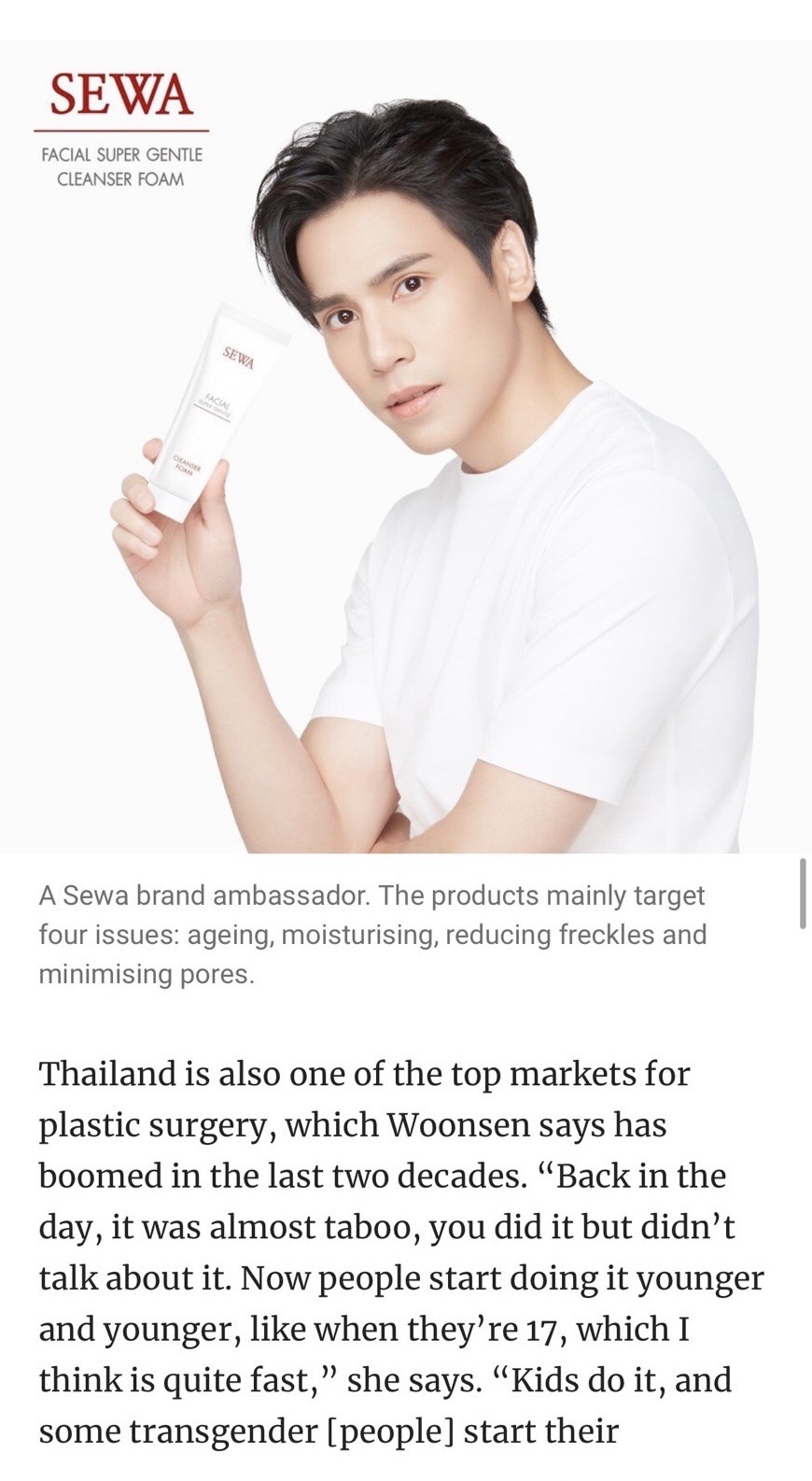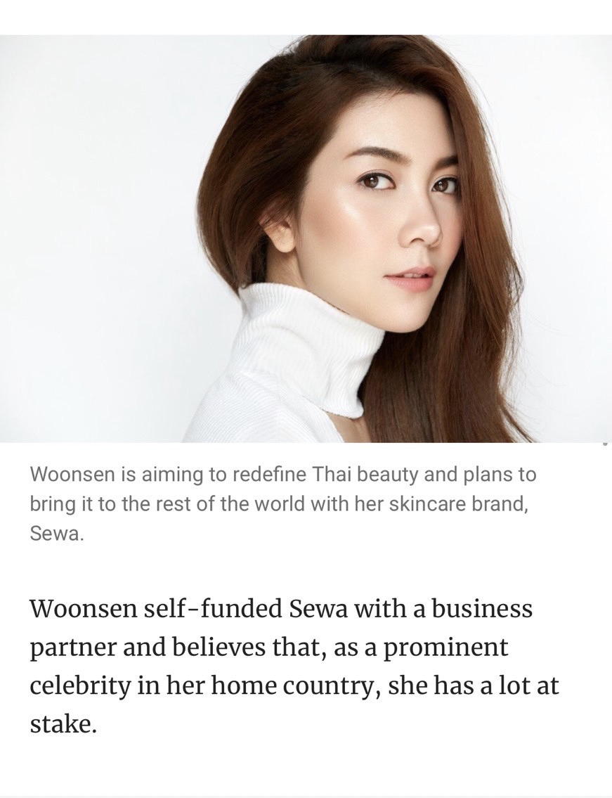 “ตอนแรกตกใจมากที่ทาง South China Morning Post ติดต่อมา เพราะเค้าถือเป็นสื่อยักษ์ใหญ่มากของจีนที่เรารู้จักมานานแล้ว ตอนแรกที่เขาติดต่อ ก็รู้สึกตื่นเต้นมาก เพราะไม่คิดว่าวันนึงเราจะอยู่ได้ไปอยู่ในหนังสือพิมพ์ระดับโลกขนาดนี้ เขาได้ยินมาว่า SEWA เป็นผลิตภัณฑ์ที่เราทำ ตอนแรกเราก็แปลกใจว่าเขาติดต่อมาได้ยังไง ซึ่งเขาก็บอกว่าเรามีแฟนคลับชาวจีนที่เคยติดตามผลงานของเราอยู่ตอนเล่นซีรี่ย์ และแฟนคลับก็พูดกันว่าตอนนี้วุ้นเส้น ทำธุรกิจสกินแคร์ที่ทำจากโสม เขาก็เลยติดต่อมา”