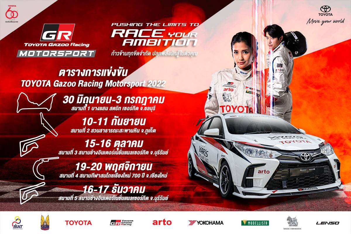 แฟนกีฬามอเตอร์สปอร์ตติดตามความสนุกของ “Toyota Gazoo Racing Motorsport 2022” ทั้ง 5 สนาม ประเดิมสนามแรกระหว่างวันที่ 30 มิถุนายน – 3 กรกฎาคม กับการกลับมาในรอบ 2 ปี ของการแข่งขันแบบสตรีทเซอร์กิตริมชายหาดบางแสน ในงานบางแสน กรังด์ปรีซ์ จ.ชลบุรี, สนามที่ 2 วันที่ 10-11 กันยายน จ.ภูเก็ต, สนามที่ 3 วันที่ 15-16 ตุลาคม จ.บุรีรัมย์, สนามที่ 4 วันที่ 19-20 พฤศจิกายน จ.เชียงใหม่ และสนามที่ 5 วันที่ 17-18 ธันวาคม จ.บุรีรัมย์