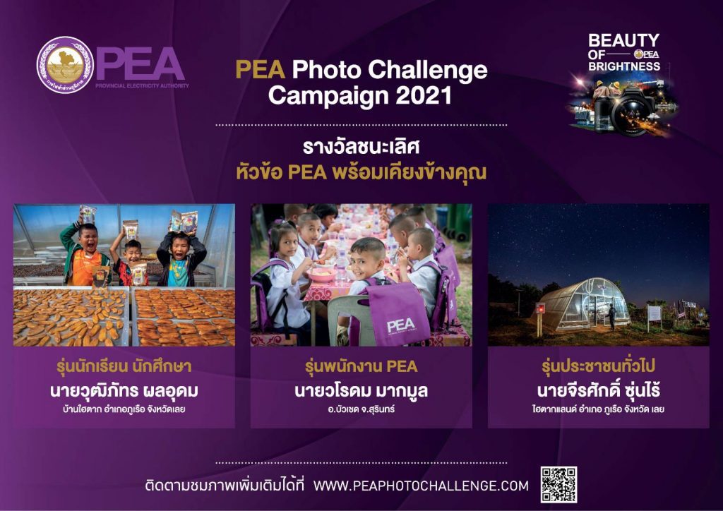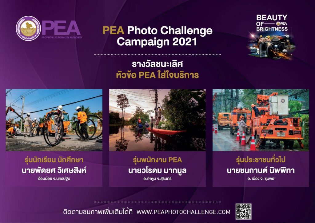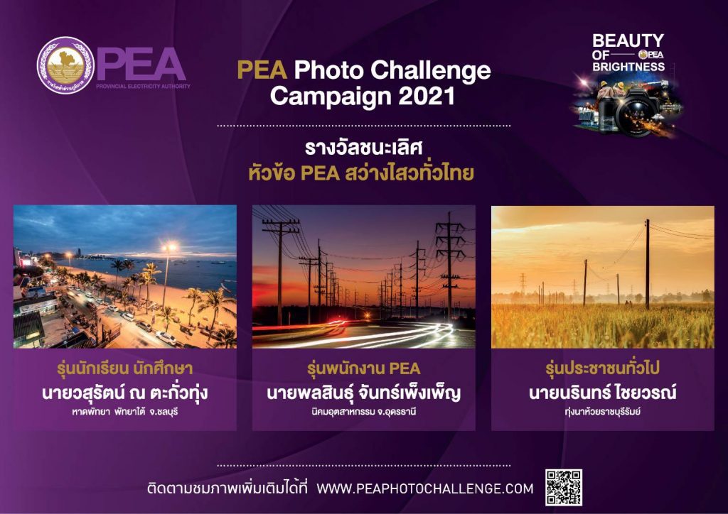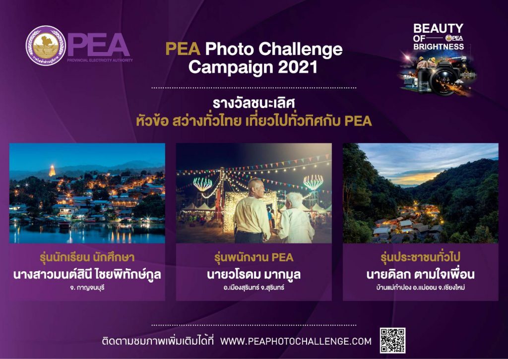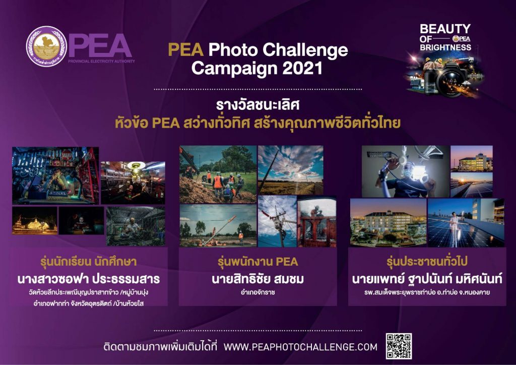 การไฟฟ้าส่วนภูมิภาค หรือ PEA จัดการประกวดภาพถ่าย PEA Photo Challenge Campaign 2021 ภายใต้แนวคิด Brightness for Life Quality เพื่อส่งเสริมและสื่อสารแบรนด์ของการไฟฟ้าส่วนภูมิภาคให้เป็นที่รู้จัก รวมทั้งสร้างชื่อเสียงและภาพลักษณ์ที่ดีให้กับองค์กร และสร้างพื้นที่ในการสร้างสรรค์ผลงานภาพถ่ายให้กับผู้ที่สนใจในการถ่ายภาพ ชิงเงินรางวัลรวมกว่า 300,000 บาท เปิดรับผู้สมัคร 3 ประเภท ได้แก่ 1. ประเภทนักเรียน-นักศึกษาอายุไม่เกิน 25 ปี 2.ประเภทผู้บริหาร พนักงาน ลูกจ้าง PEA และ 3. ประเภทประชาชนทั่วไป ภายใต้หัวข้อที่กำหนด 5 หัวข้อ ได้แก่