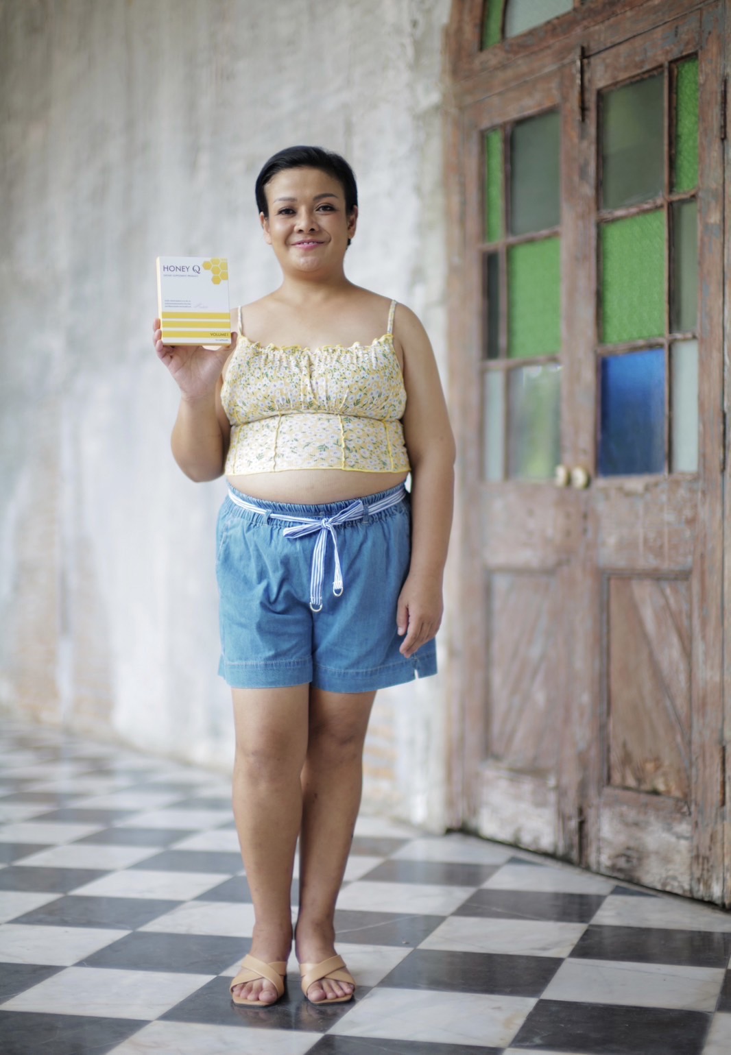 “น้ำหนักขึ้นมาเยอะมาก ตั้งแต่คลอดลูกเมื่อ 10 ปีที่แล้วน้ำหนักก็ไม่ลงอีกเลย พยายามลดเท่าไหร่ก็ไม่ลง พอไปเห็นพี่น้ำผึ้ง ณัฐริกา กับพี่เอ้ ชุติมา สามารถน้ำหนักลงได้ แล้วเขาแบบสวยมาก จากที่สวยอยู่แล้ว ยิ่งผอมลงก็ยิ่งสวย และดูเด็กมาก เราก็ตั้งใจอยากจะเป็นแบบเขาบ้าง ก็ได้เข้าไปปรึกษากับ HONEY Q ผลิตภัณฑ์ดูแลรูปร่าง ที่ทำให้ พี่น้ำผึ้งกับพี่เอ้ กลับมาหุ่นดีอีกครั้ง ทำให้ตอนนี้น้ำหนักยุ้ยลงมา 10 กิโล ดีใจมากน้ำตาไหลเลย เราไม่เคยผอมอย่างนี้มานานแล้ว พยายามเท่าไหร่ก็ไม่สำเร็จ แต่ครั้งนี้เราสามารถทำได้”