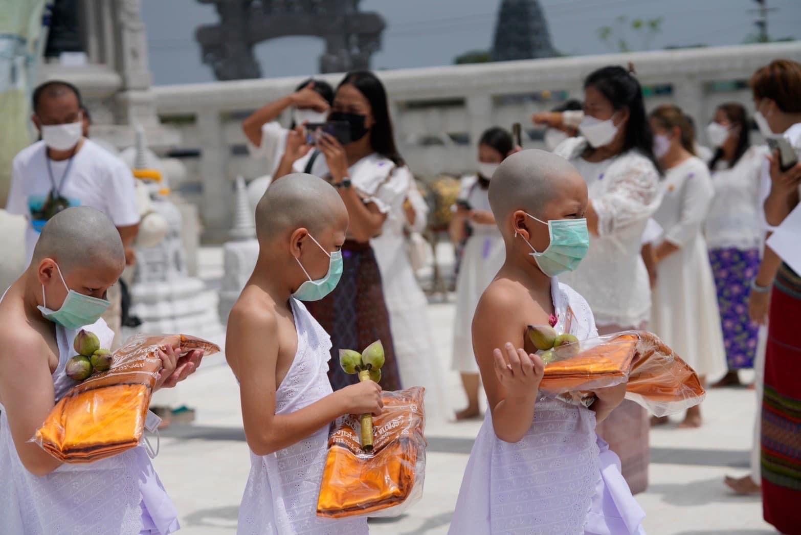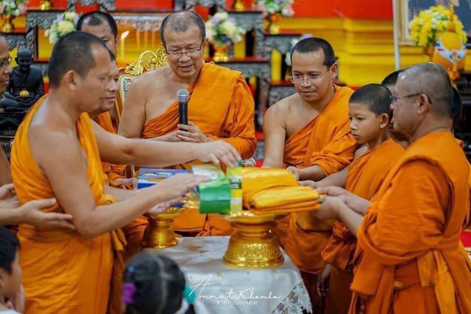 ด้วยอานิสงส์การถวายผ้าไตร ขอท่านจงเป็นผู้มีอาภรณ์งดงาม สุขใจเบิกบานทุกขณะจิต มีจิตใจที่บริสุทธิ์ หลุดพ้นความยากจนหม่นหมอง อุดมสมบูรณ์ด้วยปัจจัยสี่ เกิดภพชาติใดขอเป็นผู้มีรูปร่างหน้าตาสวยงามผิวพรรณผุดผ่องแจ่มใส
