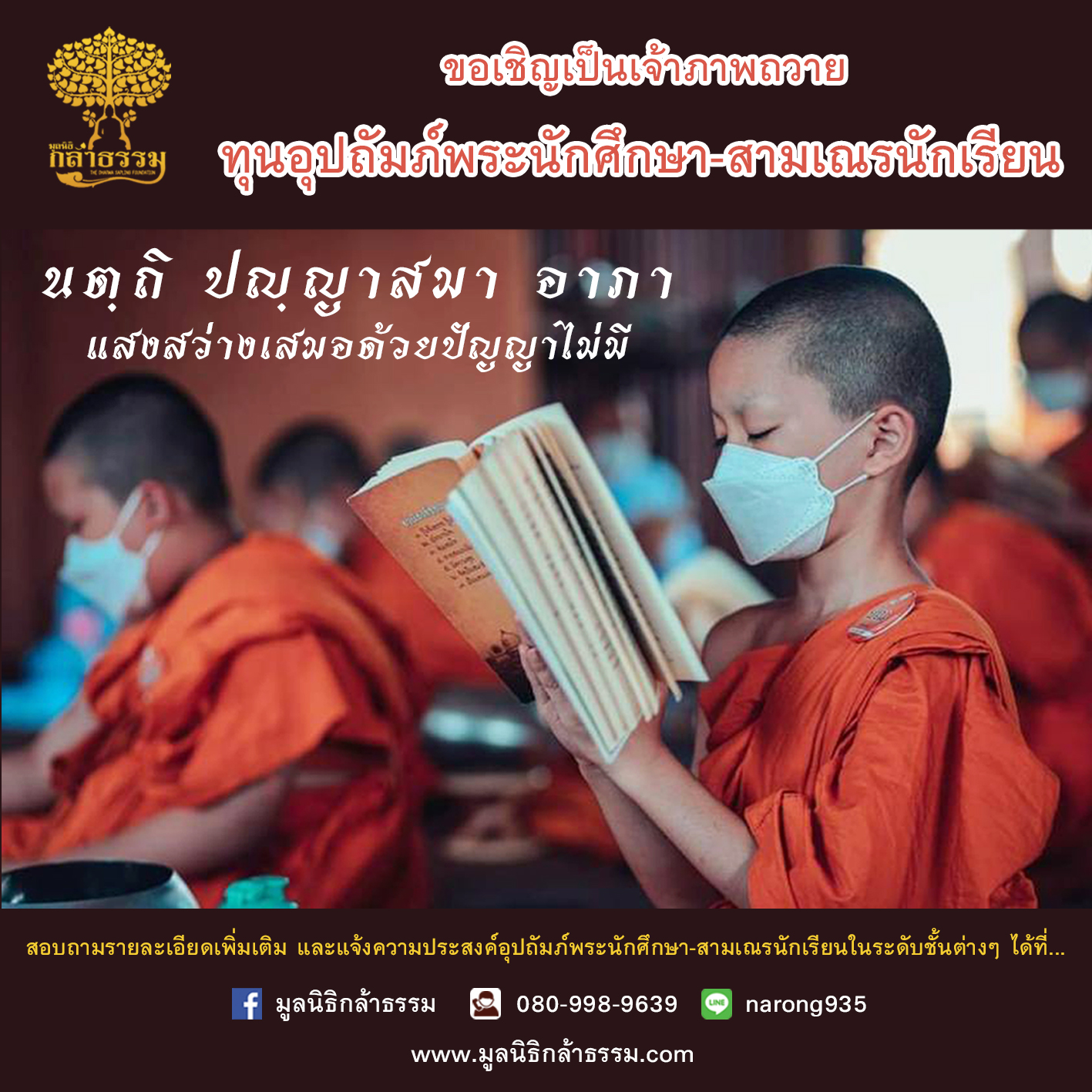 มูลนิธิกล้าธรรม ขอเชิญชวนท่านให้การอุปถัมภ์แก่พระนักศึกษา-สามเณรนักเรียน โรงเรียนพระปริยัติธรรม วิทยาลัย มหาวิทยาลัย ทั้งในประเทศไทยและต่างประเทศ ไม่ว่าจะกำลังศึกษาระดับประถมศึกษา มัธยมศึกษา ปริญญาตรี ปริญญาโท ปริญญาเอก