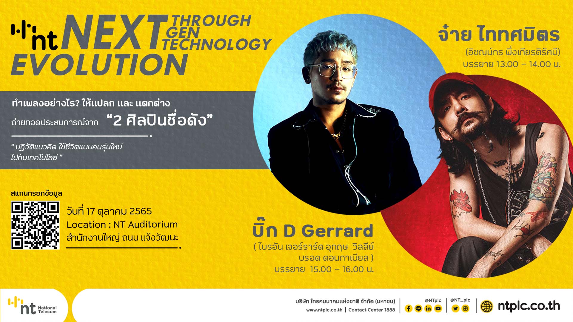 ประเดิมจัดกิจกรรมแรก NEXT THROUGH NEXT GEN NEXT TECHNOLOGY : EVOLUTION โดยนำ 2 ศิลปินชื่อดัง“จ๋าย ไททศมิตร” และ “บิ๊ก D Gerrard” ที่เป็นที่รู้จักของกลุ่มวัยรุ่นและเป็นไอดอลของใครหลาย ๆ คน มาสอนเทคนิคเกี่ยวกับเรื่องของดนตรี ตั้งแต่การร้องเพลง ทำเพลง Music Marketing หรือแนวคิดด้านการใช้ชีวิต เพื่อเป็น Know How ให้แก่กลุ่มคนที่สนใจในเรื่องดนตรี หรือกลุ่มคนที่มองแนวทางการใช้ชีวิตของผู้บรรยายเป็นแรงบันดาลใจ โดยกิจกรรมจะจัดขึ้นภายใน 1 วัน แบ่งเป็น 2 รอบ รอบละ 200 คน ในวันที่ 17 ตุลาคม 2565 เวลา 13.00 น. – 16.00 น. ณ ห้อง NT Auditorium ชั้น 2 อาคารสโมสร สำนักงานใหญ่ NT ถนน แจ้งวัฒนะ ผู้สนใจสามารถลงทะเบียนรับสิทธิ์เข้าฟังได้ฟรีทางเฟซบุ๊กเพจ NTPLC