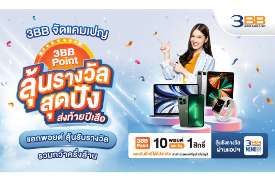 3BB แจกโชคส่งท้ายปี กับแคมเปญ “3BB Point แลกลุ้นรางวัลสุดปังส่งท้ายปีเสือ” รวมมูลค่าของรางวัลในแคมเปญกว่า 6 แสนบาท ได้แก่ APPLE MacBook Air M2 (256GB), APPLE iPhone 13 Pro (256GB) , Apple Watch Series 7 GPS+Cellular และ iPad Pro รุ่น12.9 นิ้ว 512GB WiFi+Cellular บาท รวม 19 รางวัล จับรางวัลทุกเดือน ตลอดโครงการ เพียงลูกค้านำ 3BB Point มาแลกรับสิทธิ์ร่วมกิจกรรม ระหว่างวันที่ 1 กันยายน – 31 ธันวาคม 2565 ทางแอปฯ 3BB Member
