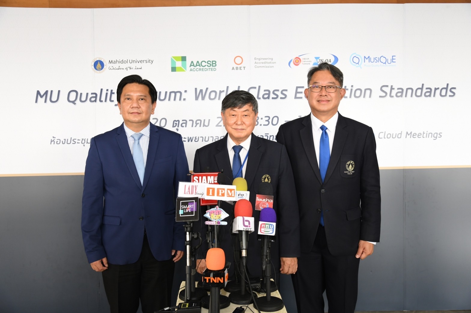 วันที่ 20 ตุลาคม 2565 ศาสตราจารย์ นายแพทย์บรรจง มไหสวริยะ อธิการบดีมหาวิทยาลัยมหิดล และ รองศาสตราจารย์ ดร. ภก.สมภพ ประธานธุรารักษ์ รองอธิการบดีฝ่ายพัฒนาคุณภาพและบริการวิชาการ มหาวิทยาลัยมหิดล พร้อมด้วย รองศาสตราจารย์ ดร.จักรกฤษณ์ ศุทธากรณ์ คณะวิศวกรรมศาสตร์ มหาวิทยาลัยมหิดล แถลงผลการรับรองคุณภาพหลักสูตรระดับนานาชาติ และความสำเร็จของการได้รับรองมาตรฐาน ABET ณ ห้องประชุมภัทรมหาราชการุณย์ คณะพยาบาลศาสตร์ มหาวิทยาลัยมหิดล ศาลายา