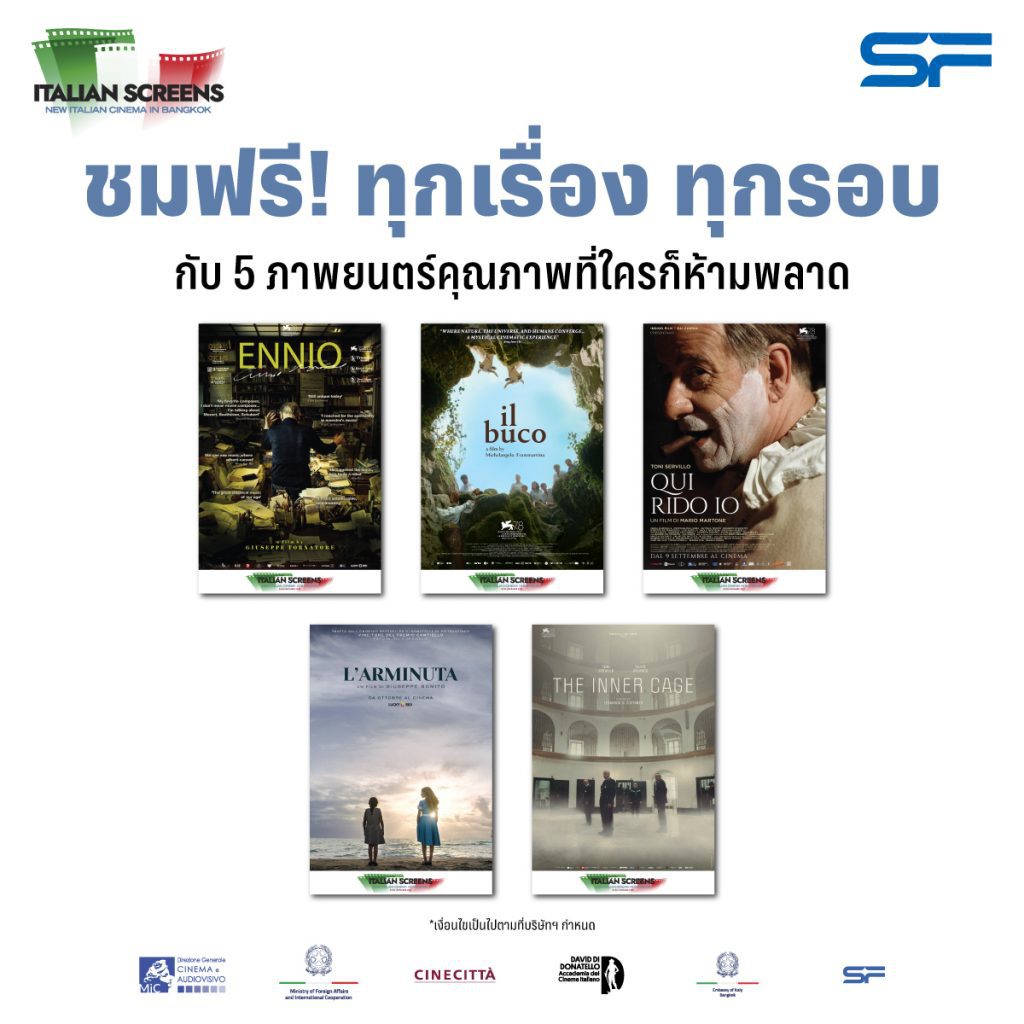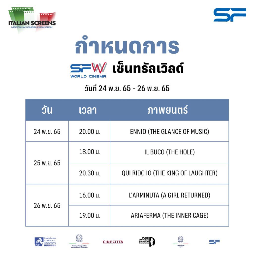 สถานทูตอิตาลีประจำประเทศไทย ร่วมกับ บริษัท เอส เอฟ คอร์ปอเรชั่น จำกัด(มหาชน) จัดงาน “เทศกาลภาพยนตร์อิตาลี 2565 (Italian Film Festival Bangkok 2022)” ฉลอง 154 ปี ความสัมพันธ์ระหว่างประเทศไทยและอิตาลี คัดสรรภาพยนตร์คุณภาพจากอิตาลีทั้งภาพยนตร์ใหม่และภาพยนตร์ระดับตำนาน จำนวน 5 เรื่อง อาทิ “ENNIO(THE GLANCE OF MUSIC)”, “IL BUCO (THE HOLE)”, “QUI RIDO IO(THE KING OF LAUGHTER)”, “L’ARMINUTA (A GIRL RETURNED)” และ “ARIAFERMA(THE INNER CAGE)” มาให้เลือกรับชมกันอย่างเต็มอิ่ม ตั้งแต่วันที่ 24-26 พฤศจิกายน 2565 โดยไม่มีค่าใช้จ่าย ณ โรงภาพยนตร์ เอส เอฟ เวิลด์ ซีเนม่า ศูนย์การค้าเซ็นทรัลเวิลด์