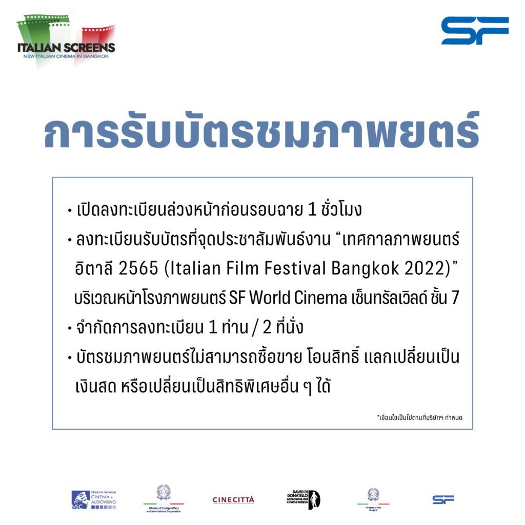 ผู้สนใจชมภาพยนตร์สามารถรับบัตรชมภาพยนตร์โดยลงทะเบียนรับบัตรที่จุดประชาสัมพันธ์งาน “เทศกาลภาพยนตร์อิตาลี 2565 (Italian Film Festival Bangkok 2022)” บริเวณหน้าโรงภาพยนตร์ล่วงหน้า 1 ชั่วโมง เพื่อความสะดวกสบายผู้ชมสามารถเช็กรอบฉายภาพยนตร์ในเทศกาลผ่าน www.sfcinema.com ได้ตั้งแต่วันนี้เป็นต้นไป หรือตรวจสอบรายละเอียดเพิ่มเติมได้ผ่านแอปพลิเคชัน SF Cinema, www.sfcinema.com พร้อมทั้งสามารถติดตามข่าวสารและสอบถามรายละเอียดได้ผ่านโซเชียลมีเดีย WeLoveSF และ #SFcinema