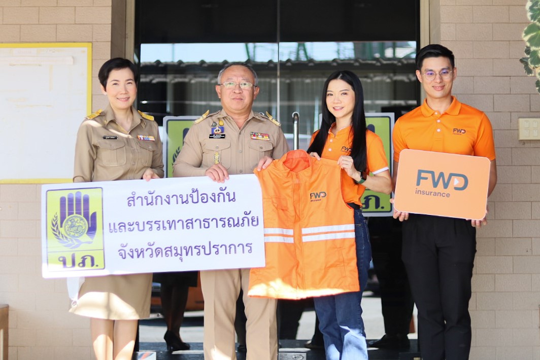 บริษัท เอฟดับบลิวดี ประกันชีวิต จำกัด (มหาชน) (“FWD ประกันชีวิต”) นำโดย นางสาวปวริศา ชุมวิกรานต์ (ที่ 3 จากซ้าย) ประธานเจ้าหน้าที่สายงานภาพลักษณ์และสื่อสารองค์กร มอบเสื้อจราจรสะท้อนแสง 100 ตัว ให้กับกลุ่มอาสาจราจรในจังหวัดสมุทรปราการ เพื่อร่วมโครงการรณรงค์ความปลอดภัยทางถนนในช่วงเทศกาลปีใหม่ 2566 กับสำนักงานคณะกรรมการกำกับและส่งเสริมการประกอบธุรกิจประกันภัย (คปภ.) โดยมี นายพชร ศศิชาชยามร (ที่ 2 จากซ้าย) หัวหน้าสำนักงานป้องกันและบรรเทาสาธารณภัยจังหวัดสมุทรปราการ เป็นตัวแทนรับมอบ ณ สำนักงานป้องกันและบรรเทาสาธารณภัยจังหวัดสมุทรปราการ
