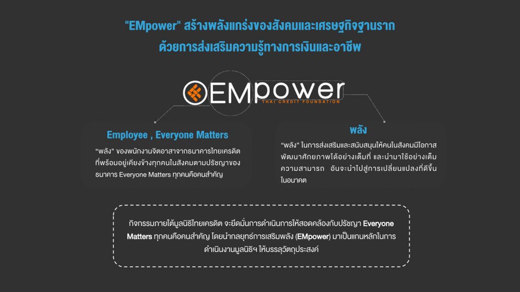 นายวิญญู ไชยวรรณ ประธานมูลนิธิไทยเครดิต เปิดเผยว่า ”มูลนิธิฯ จะยึดมั่นการดำเนินการให้สอดคล้องกับปรัชญาของธนาคารที่ว่า Everyone Matters ทุกคนคือคนสำคัญ โดยนำแนวคิด EMpower การเสริมพลัง มาเป็นแกนหลักในการดำเนินงานเพื่อส่งเสริมทักษะด้านการเงิน ผ่านโครงการตังค์โต Know-how เพื่อเสริมสร้างพลังแกร่งสู่กลุ่มเป้าหมายทุกภูมิภาคทั่วประเทศ และสู่ชุมชนที่มีคุณภาพชีวิตต่ำกว่าเกณฑ์