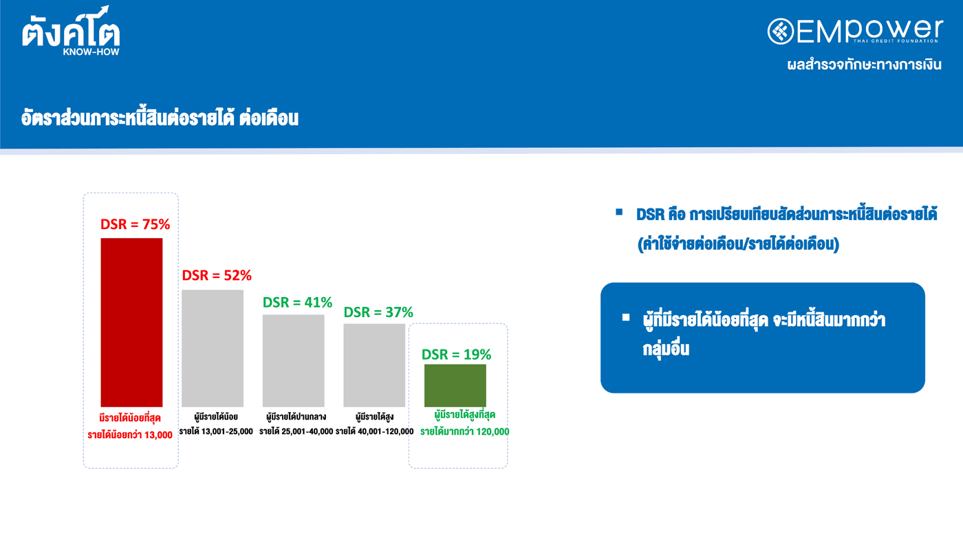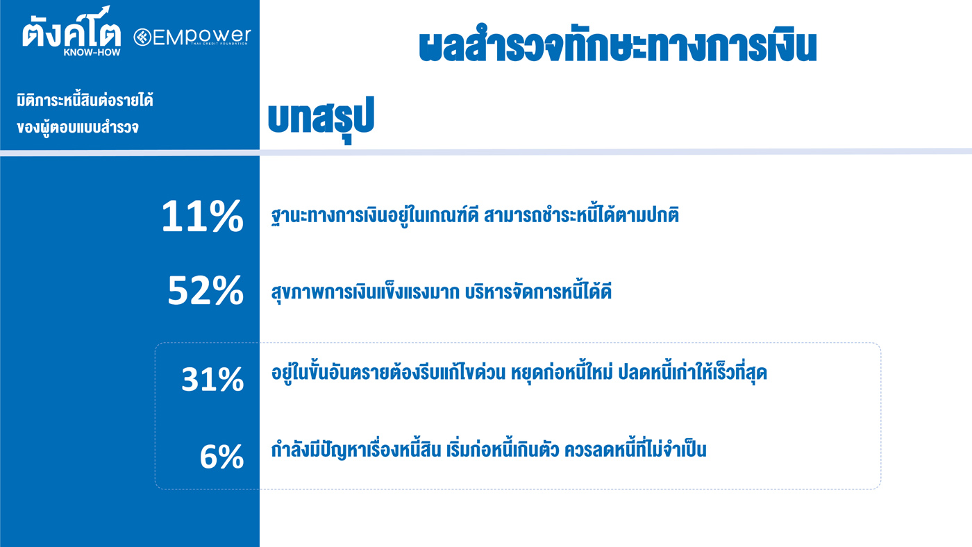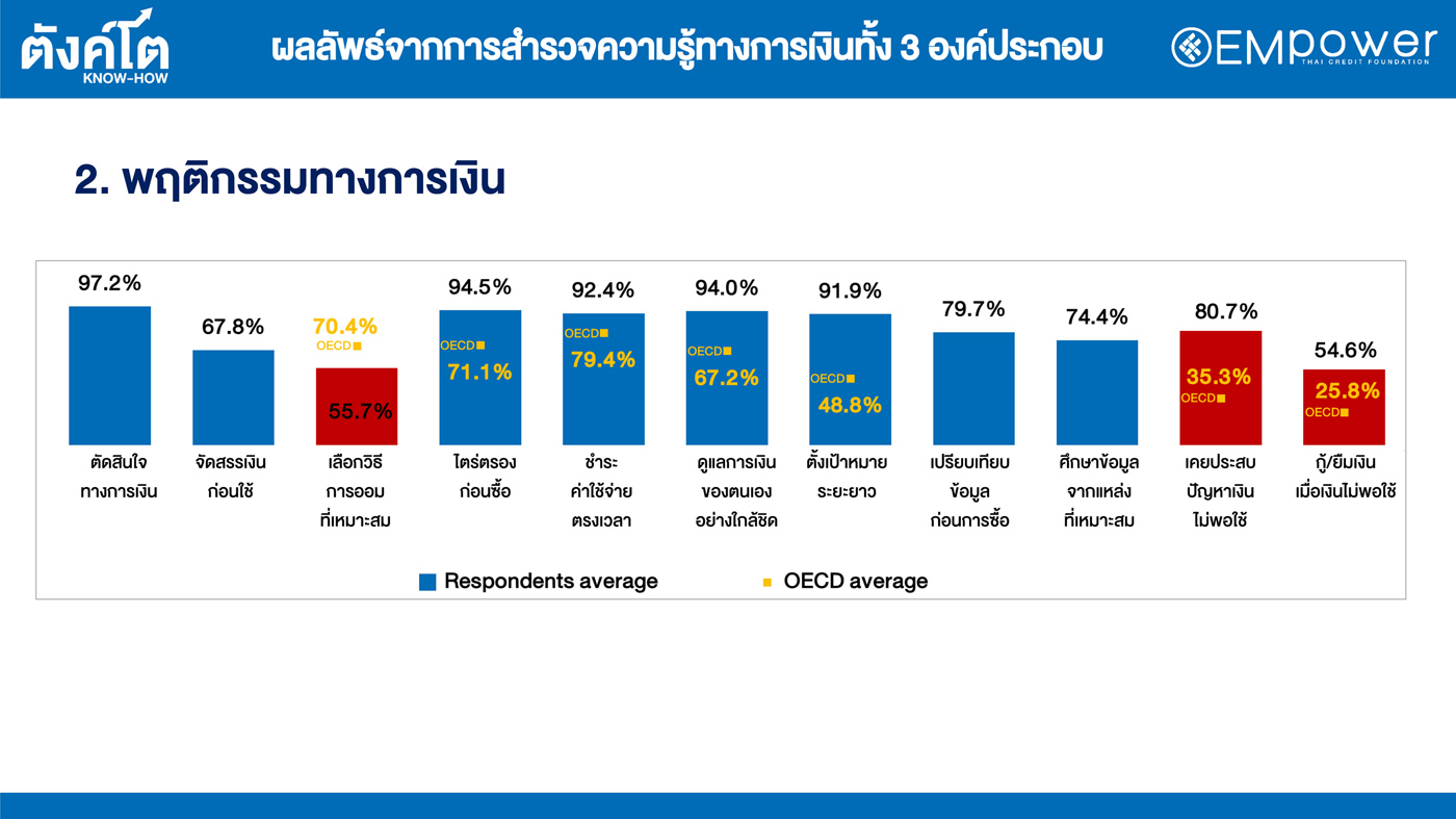 นายรอย ออกุสตินัส กุนารา รองประธานมูลนิธิไทยเครดิต ย้ำถึงการเสริมสร้างความรู้ทางการเงินจะตอบโจทย์การสร้างคุณภาพชีวิตที่ดีขึ้น “จากผลสำรวจ 844 ตัวอย่างทั่วประเทศ ระหว่างวันที่ 10 ธันวาคม 2022 – 3 มกราคม 2023 ตามมาตรฐานการสำรวจระดับทักษะทางการเงินของคนไทยตามกรอบของ The Organization for Economic Co-operation and Development (OECD) พบว่าคนไทยมีทักษะทางการเงินอยู่ที่ 79.3% ซึ่งสูงกว่าค่าเฉลี่ยของ OECD ที่ 60.5% แต่เมื่อวิเคราะห์ในเชิงลึก กลับพบว่าคนไทยมีพฤติกรรมด้านการออมเงินที่เหมาะสมเพียง 55.7% ซึ่งต่ำกว่าค่าเฉลี่ยของ OECD ที่ 70.4% ในขณะที่คนไทย 80.7% ประสบปัญหาเงินไม่พอใช้ซึ่งสูงกว่าค่าเฉลี่ยของ OECD ที่ 35.3% นอกจากนี้คนไทยอีก 54.6% มักจะมีการกู้ยืมเงินเมื่อเงินไม่พอใช้ ซึ่งสูงกว่าค่าเฉลี่ยของ OECD ที่ 25.8% จึงเป็นการสะท้อนให้เห็นว่า ควรให้ความสำคัญเรื่องการส่งเสริมความรู้ทางการเงินให้แก่ประชาชน โดยมุ่งเน้นให้ประชาชนตระหนักถึงความสำคัญของการออม รู้จักวิธีการออมเงินที่เหมาะสม รู้จักวิธีการบริหารจัดการรายได้ให้เพียงพอกับค่าใช้จ่าย จัดสรรเงินก่อนใช้ ใช้จ่ายเท่าที่จำเป็น ไม่ก่อหนี้สินจนเกินตัว เพื่อหลีกเลี่ยงปัญหาหนี้ครัวเรือนที่เป็นปัญหาใหญ่ของประเทศ