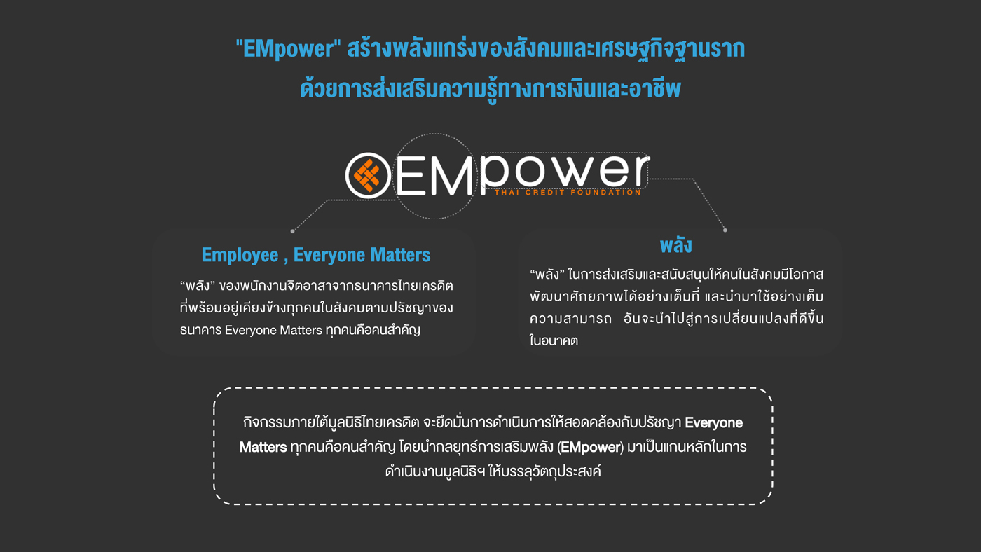 มูลนิธิฯ จะดำเนินโครงการ “EMpower เพื่อชุมชนที่ยั่งยืน” ในพื้นที่นำร่อง แบบบูรณาการครบทุกมิติ ทั้งการเสริมสร้างความรู้ทางการเงิน สร้างอาชีพ สร้างรายได้ รวมถึงการส่งเสริมศิลปะ วัฒนธรรม สิ่งแวดล้อม เพื่อสร้างชุมชนที่ดี แข็งแกร่ง มีคุณภาพชีวิตที่ดีขึ้น”