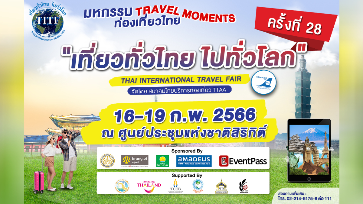 กลับมาเอาใจคนชอบท่องเที่ยว รักการเดินทาง กันอีกครั้ง กับงานมหกรรมท่องเที่ยวครั้งยิ่งใหญ่ของปี “เที่ยวทั่วไทย ไปทั่วโลก” ครั้งที่ 28 Thai International Travel Fair 2023 (TITF#28) ระหว่างวันที่ 16-19 กุมภาพันธ์ 2566 ณ Exhibition Hall 8 ศูนย์การประชุมแห่งชาติสิริกิติ์ ตั้งแต่เวลา 10.00-20.00 น.