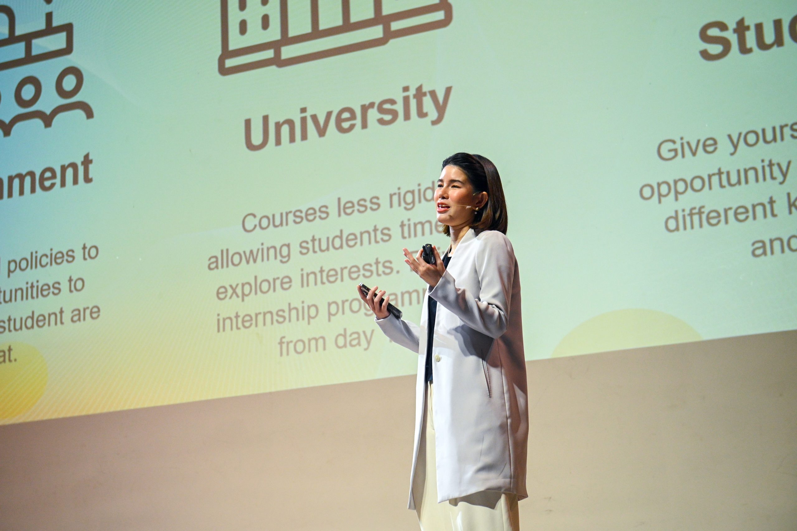 สำหรับหัวข้อ TEEN คุณวทันยา อมตานนท์ เล่าถึงประสบการณ์ของตัวเองในฐานะคนที่ไม่ได้ทำงานตามสิ่งที่ตนเองจบมาโดยตรงตั้งแต่แรก และชวนตั้งคำถามถึงระบบการศึกษา โดยมองว่า ทุกคนควรได้ค้นหาในสิ่งที่แต่ละคนชอบมากกว่านี้ พร้อมเสนอแนวทางแก้ปัญหาที่เร็วและง่ายที่สุดคือ ‘การฝึกงาน’ โดยรัฐบาล, มหาวิทยาลัย และภาคธุรกิจต้องช่วยกันเปิดกว้างเพื่อให้คนรุ่นใหม่ได้ค้นหาตัวเองมากขึ้น