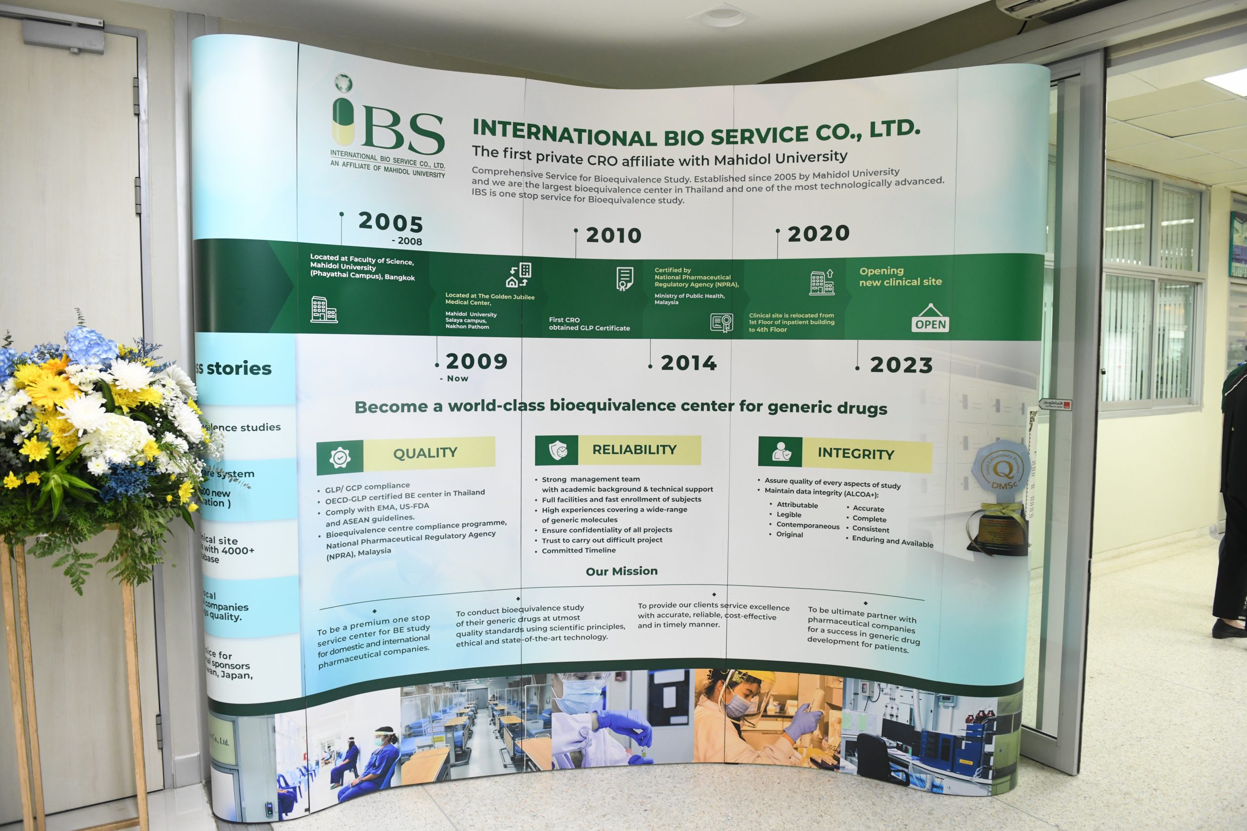 วันพุธที่ 15 มีนาคม 2566 เวลา 10.00 น. บริษัท อินเตอร์เนชั่นแนล ไบโอ เซอร์วิส จำกัด เปิดสถานที่วิจัยทางคลินิก เพื่อให้บริการด้านการศึกษาวิจัยทางชีวสมมูลแบบครบวงจร โดยมี ศาสตราจารย์คลินิกเกียรติคุณ นพ.ปิยะสกล สกลสัตยาทร นายกสภามหาวิทยาลัยมหิดล พร้อมด้วย ศาสตราจารย์ นายแพทย์บรรจง มไหสวริยะ อธิการบดี มหาวิทยาลัยมหิดล เป็นประธานเปิดสถานที่วิจัยทางคลินิก บริษัท อินเตอร์เนชั่นแนล ไบโอ เซอร์วิส จำกัด (International Bio Service Co., Ltd.) ณ บริษัท อินเตอร์เนชั่นแนล ไบโอ เซอร์วิส จำกัด ชั้น 4 ศูนย์การแพทย์กาญจนาภิเษก คณะแพทยศาสตร์ศิริราชพยาบาล มหาวิทยาลัยมหิดล ศาลายา