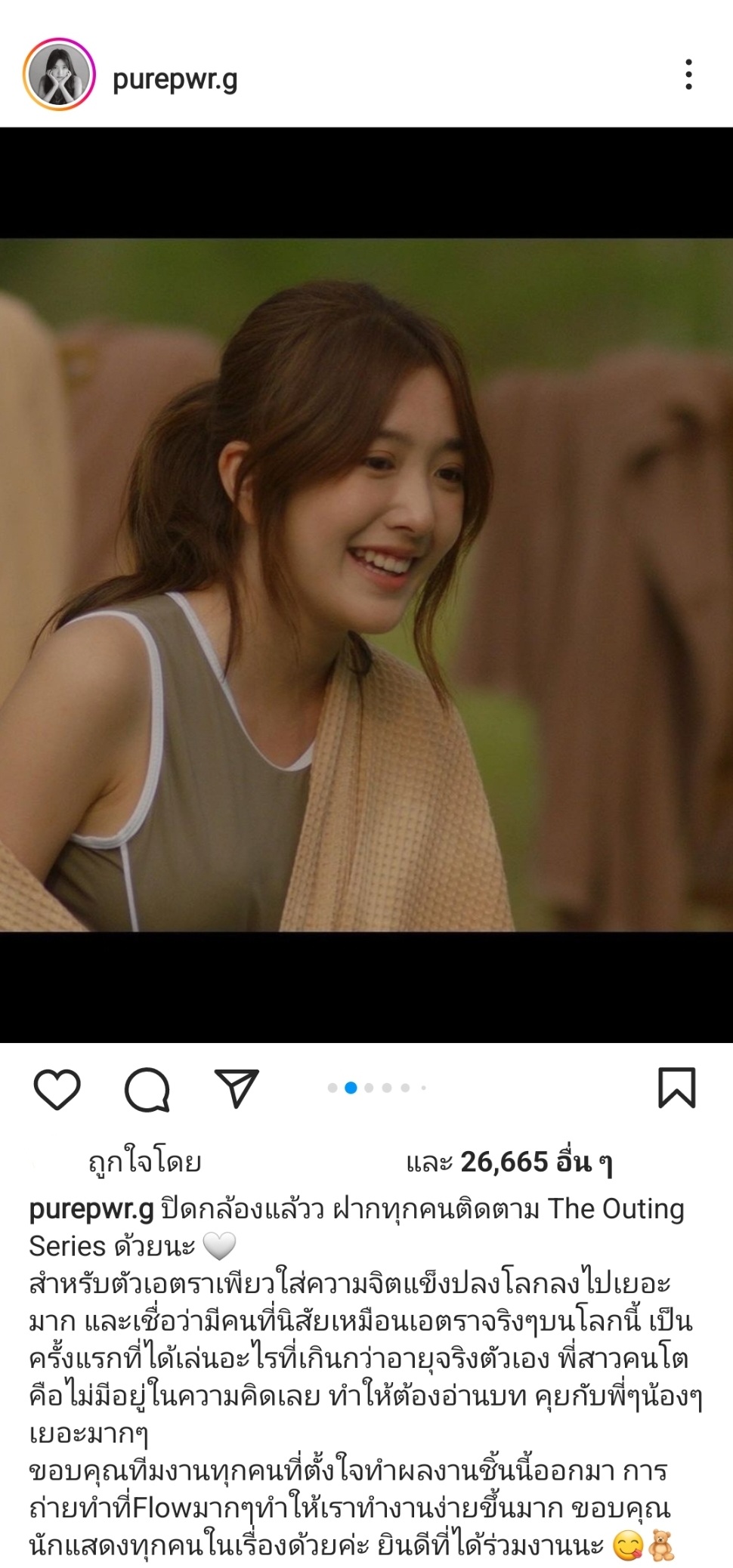 และ “เพียว-เพียววรินทร์ กอศิริวลานนท์” นักแสดงดาวรุ่งจากสังกัด Bob Cat ที่รับบท “เอตรา” ก็เผยถึงประสบการณ์ดีๆ ที่ได้รับจากกองถ่าย “THE OUTING” ผ่านทางอินสตาแกรม @purepwr.g ด้วยเช่นกัน “ปิดกล้องแล้ว ฝากทุกคนติดตาม The Outing Series ด้วยนะ สำหรับตัวเอตราเพียวใส่ความจิตแข็งปลงโลกลงไปเยอะมาก และเชื่อว่ามีคนที่นิสัยเหมือนเอตราจริงๆ บนโลกนี้ เป็นครั้งแรกที่ได้เล่นอะไรที่เกินกว่าอายุจริงตัวเอง พี่สาวคนโตคือไม่มีอยู่ในความคิดเลย ทำให้ต้องอ่านบท คุยกับพี่ๆ น้องๆ เยอะมากๆ ขอบคุณทีมงานทุกคนที่ตั้งใจทำผลงานชิ้นนี้ออกมา การถ่ายทำที่Flow มากๆ ทำให้เราทำงานง่ายขึ้นมาก ขอบคุณนักแสดงทุกคนในเรื่องด้วยค่ะ ยินดีที่ได้ร่วมงานนะ”