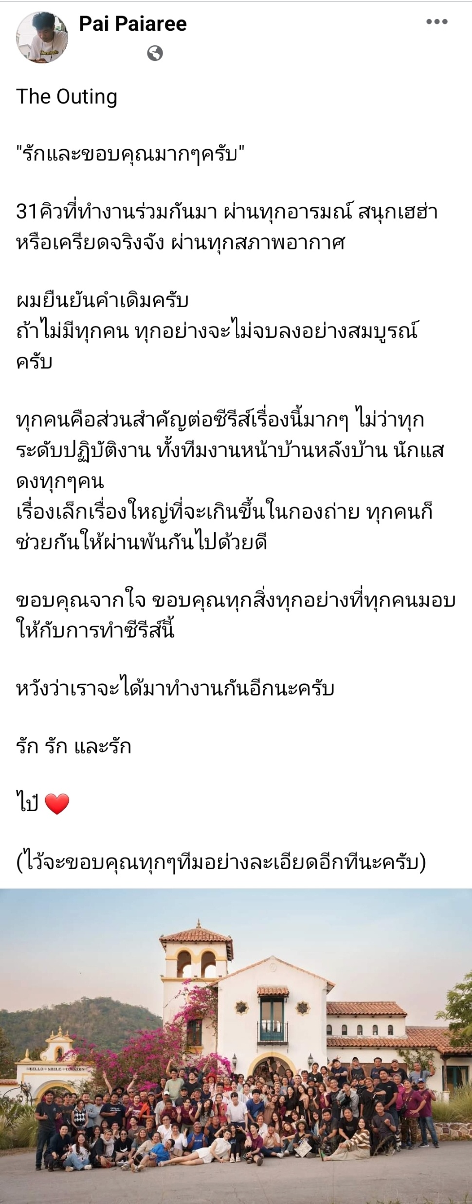 ทางด้านผู้กำกับมือรางวัล “ไป๋-เอกภพ ไป๋อารีย์” ก็บรรยายความในใจไว้ที่เฟซบุ้ค Pai Paiaree อย่างน่าประทับใจ “The Outing “รักและขอบคุณมากๆครับ” 31คิวที่ทำงานร่วมกันมา ผ่านทุกอารมณ์ สนุกเฮฮาหรือเครียดจริงจัง ผ่านทุกสภาพอากาศ ผมยืนยันคำเดิมครับ ถ้าไม่มีทุกคน ทุกอย่างจะไม่จบลงอย่างสมบูรณ์ครับ ทุกคนคือส่วนสำคัญต่อซีรีส์เรื่องนี้มากๆ ไม่ว่าทุกระดับปฏิบัติงาน ทั้งทีมงานหน้าบ้านหลังบ้าน นักแสดงทุกๆคน เรื่องเล็กเรื่องใหญ่ที่จะเกินขึ้นในกองถ่าย ทุกคนก็ช่วยกันให้ผ่านพ้นกันไปด้วยดี ขอบคุณจากใจ ขอบคุณทุกสิ่งทุกอย่างที่ทุกคนมอบให้กับการทำซีรีส์นี้ หวังว่าเราจะได้มาทำงานกันอีกนะครับ รัก รัก และรัก – ไป๋ ❤”