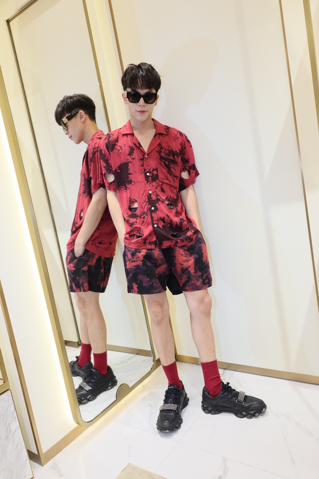 ส่วนทางด้าน 2 หนุ่ม ออฟ-จุมพล และ กัน-อรรถพันธ์ มาในลุคเท่ๆ ชิลล์ๆ โดย กัน ใส่เสื้อเชิ้ตแขนยาว โอเวอร์ไซส์ แมทช์กับกางเกงไหมพรมขาสั้น สีขาว เพิ่มความน่าสนใจให้ลุคด้วยกระเป๋าหนังสี Silver แมทช์กับสนีกเกอร์สีขาว ส่วน ออฟ มาชุดขาวดำ เลือกกระเป๋าหนังสีดำ แมทช์กับสนีกเกอร์สีดำ หล่อเท่ไม่แพ้กัน