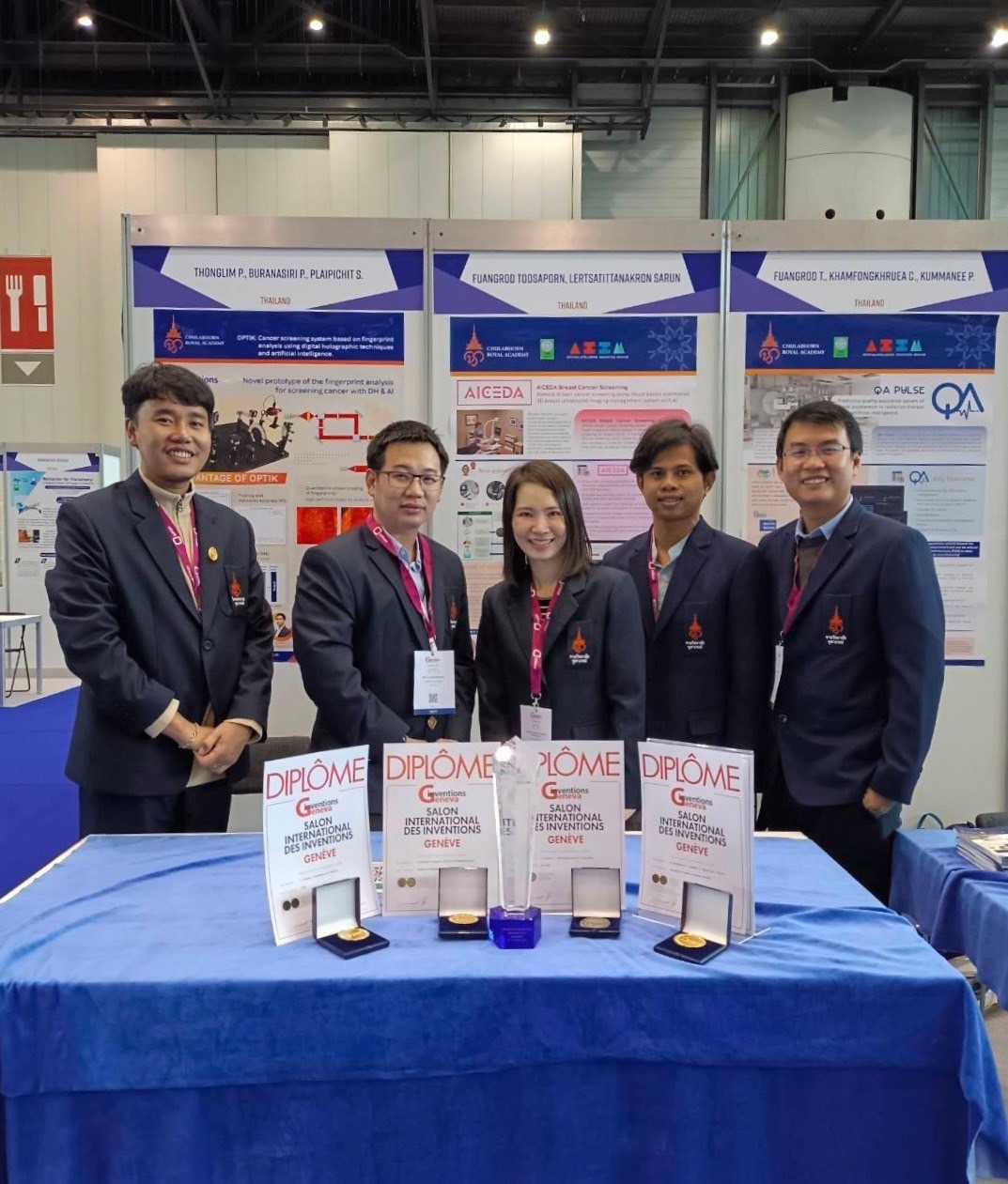 2.รางวัล GOLD MEDAL และ Special prize จาก Hong Kong Delegation ชื่อผลงาน “การคัดกรองมะเร็งเต้านมทางไกลโดยใช้ระบบบริหารจัดการภาพอัลตราซาวด์สามมิติอัตโนมัติด้วยเทคโนโลยีคลาวน์และปัญญาประดิษฐ์” เป็นระบบการตรวจคัดกรองมะเร็งเต้านมทางไกลโดยใช้เทคโนโลยีภาพอัลตราซาวด์สามมิติอัตโนมัติ (3D ABUS) บนคลาวด์ร่วมกับปัญญาประดิษฐ์ต่อการตรวจคัดกรองมะเร็งเต้านม โดยเฉพาะในพื้นที่ห่างไกล ระบบสามารถตรวจจับตำแหน่งและขอบเขตของรอยโรคได้โดยอาศัยการเรียนรู้เชิงลึก (Deep learning) อีกทั้งมีการจำแนกก้อนเนื้อชนิดไม่เป็นอัตรายและชนิดที่มีแนวโน้มเป็นมะเร็งโดยอาศัยเทคนิค Radiomic ระบบดังกล่าวสามารถให้ค่าระดับความเสี่ยงต่อโรคมะเร็งเต้านมรวมทั้งข้อแนะนำการตรวจวินิจฉัยที่เหมาะสมกับผู้ป่วยโดยอัตโนมัติ มีจุดเด่นและความแปลกใหม่ คือ การสร้าง Workflow ในการให้บริการตรวจคัดกรองมะเร็งเต้านมด้วยเทคโนโลยีใหม่ร่วมกับปัญญาประดิษฐ์ ส่งผลให้การให้บริการมีต้นทุนต่ำและสามารถให้บริการในพื้นที่ห่างไกลได้