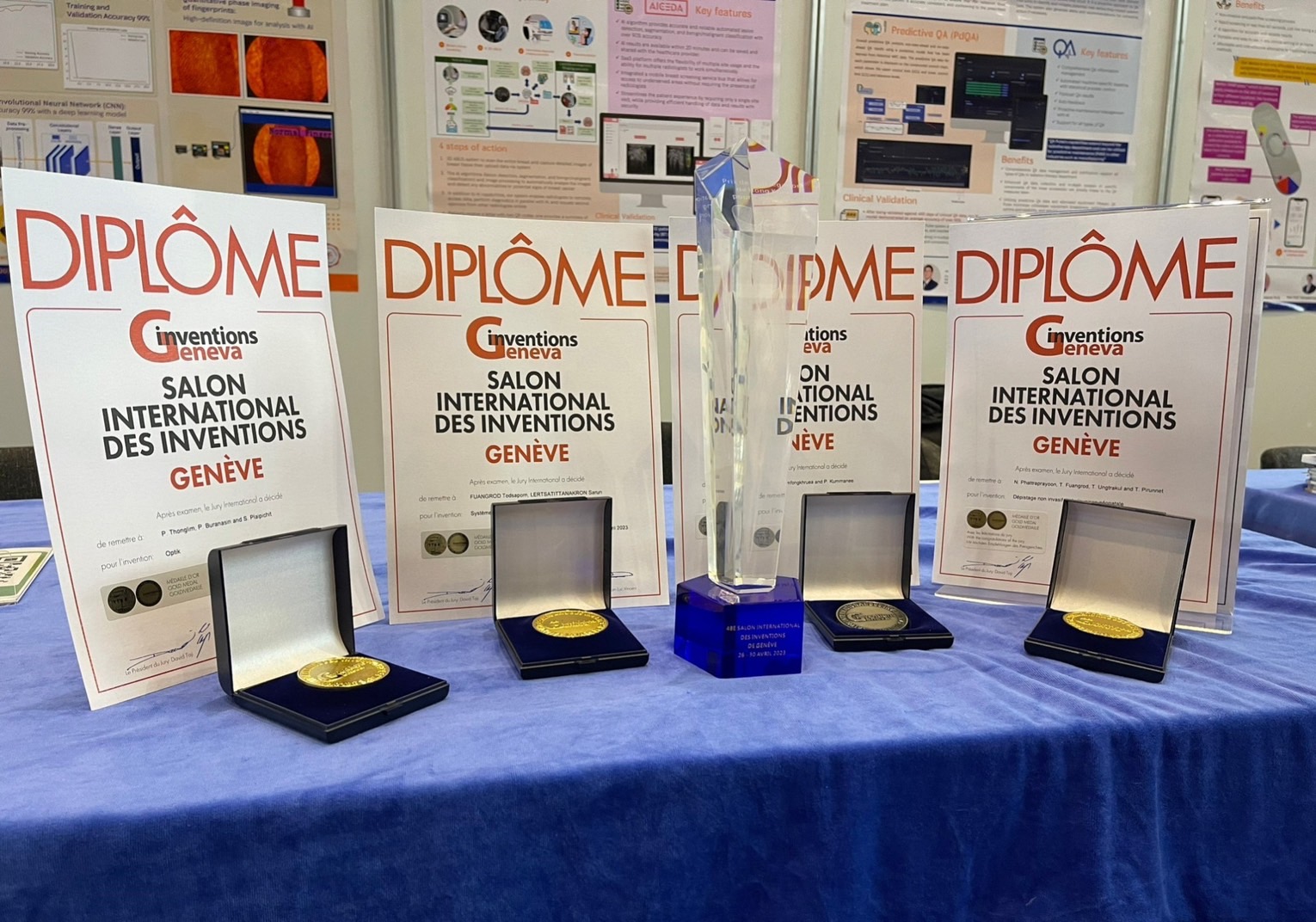 3.รางวัล GOLD MEDAL (with the congratulations of the jury) ชื่อผลงาน “เทคโนโลยีต้นทุนต่ำสำหรับการตรวจคัดกรองภาวะตัวเหลืองในทารกแรกเกิดด้วยปัญญาประดิษฐ์” เป็นเทคโนโลยีการตรวจภาวะตัวเหลืองสำหรับทารกแรกเกิดชนิดไม่รุกล้ำ โดยอาศัยอุปกรณ์ที่เข้าถึงได้ง่ายในทุกกลุ่มประชากร เพื่อให้ทารกทุกคนได้รับการเข้าถึงการตรวจคัดกรองและรักษาภาวะตัวเหลืองได้อย่างทันท่วงทีและเหมาะสม โดยผ่านทางอุปกรณ์และเทคโนโลยีปัญญาประดิษฐ์ สามารถใช้งานได้ง่าย ต้นทุนต่ำ เชื่อถือได้ และเพิ่มโอกาสการเข้าถึงได้ทุกกลุ่ม อีกทั้งสามารถเชื่อมต่อข้อมูลไปยังโรงพยาบาลระดับทุติยภูมิและตติยภูมิผ่านเทคโนโลยีคลาวน์ จุดเด่นหรือความแปลกใหม่ คือ ไม่มีอาการเจ็บเนื่องจากเป็นการตรวจชนิดไม่รุกล้ำ สามารถตรวจได้บ่อยเท่าที่ต้องการ ทุกคนทำการตรวจเองได้แม้ไม่ใช่บุคลากรทางการแพทย์ ราคาไม่แพง และใช้ได้ทุกที่มีอินเทอร์เน็ต