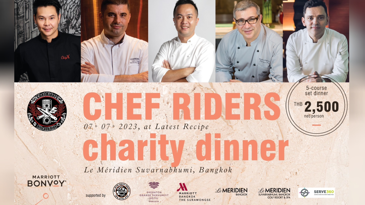 มิถุนายน 2566 – เตรียมพบกับ The Chef Riders มื้อค่ำเพื่อการกุศลที่ เลอ เมอริเดียน สุวรรณภูมิ กรุงเทพฯ กอล์ฟ รีสอร์ท แอนด์ สปา เร็วๆ นี้ กับมื้ออาหารสุดพิเศษที่รังสรรค์เมนูจากวัตถุดิบที่มุ่งให้ความสำคัญในด้านความยั่งยืน เพื่อนำรายได้ไปช่วยเหลือเด็กด้อยโอกาสในประเทศไทย
