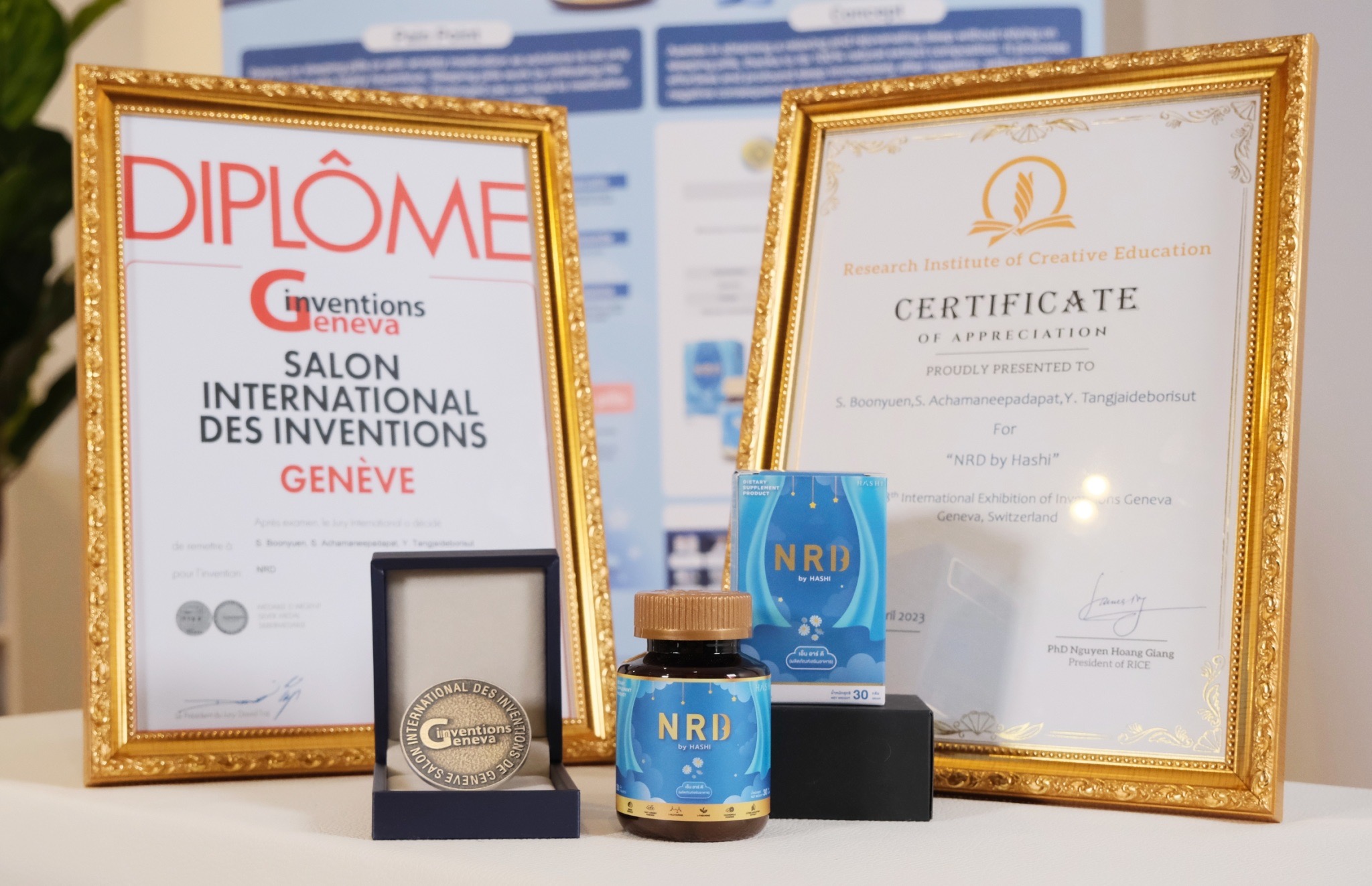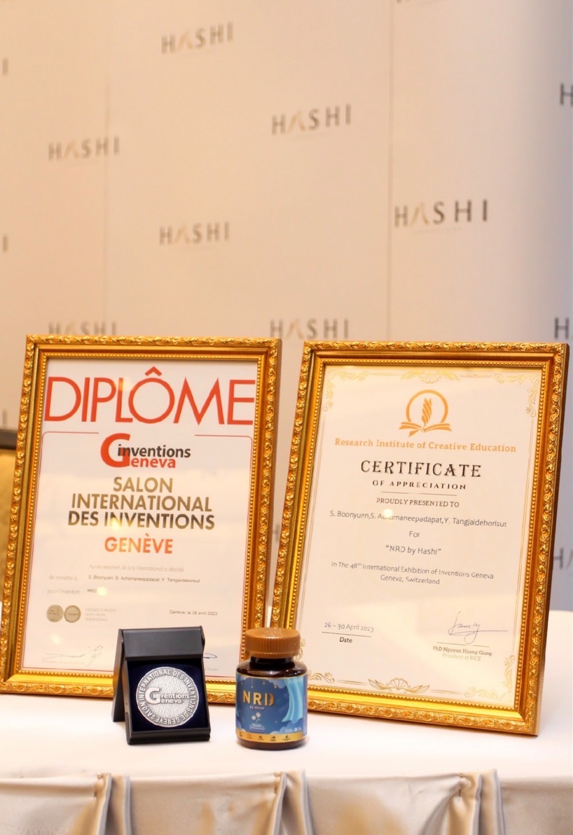 หลังจากที่ผลิตภัณฑ์สัญชาติไทยภายใต้แบรนด์ NRD By HASHI คว้ารางวัลเหรียญเงินยอดเยี่ยมจากคณะกรรมการประกวดนวัตกรรมในงาน The International Exhibition of Inventions of Geneva ซึ่งเป็นงานระดับนานาชาติที่ปีนี้จัดขึ้นเป็นครั้งที่ 48th ระหว่างวันที่ 26 – 30 เมษายน ที่ผ่านมา ณ หอประชุมนานาชาติ Palexpo ในเมือง Geneva ประเทศสวิตเซอร์แลนด์ ซึ่งแบรนด์ NRD By HASHI ผลิตโดย บริษัท ฮาชิ แลบอราทอรี (ประเทศไทย) จำกัด จับมือหน่วยงานชั้นนำระดับประเทศ มหาวิทยาลัยธรรมศาสตร์ และ สำนักงานการวิจัยแห่งชาติ (วช.) พร้อมด้วยบุคลากรระดับหัวกะทิทั้ง เภสัชกร แพทย์ และ นักวิทยาศาสตร์ ร่วมกันพัฒนาผลิตภัณฑ์อาหารเสริมสำหรับผู้นอนไม่หลับสัญชาติไทย