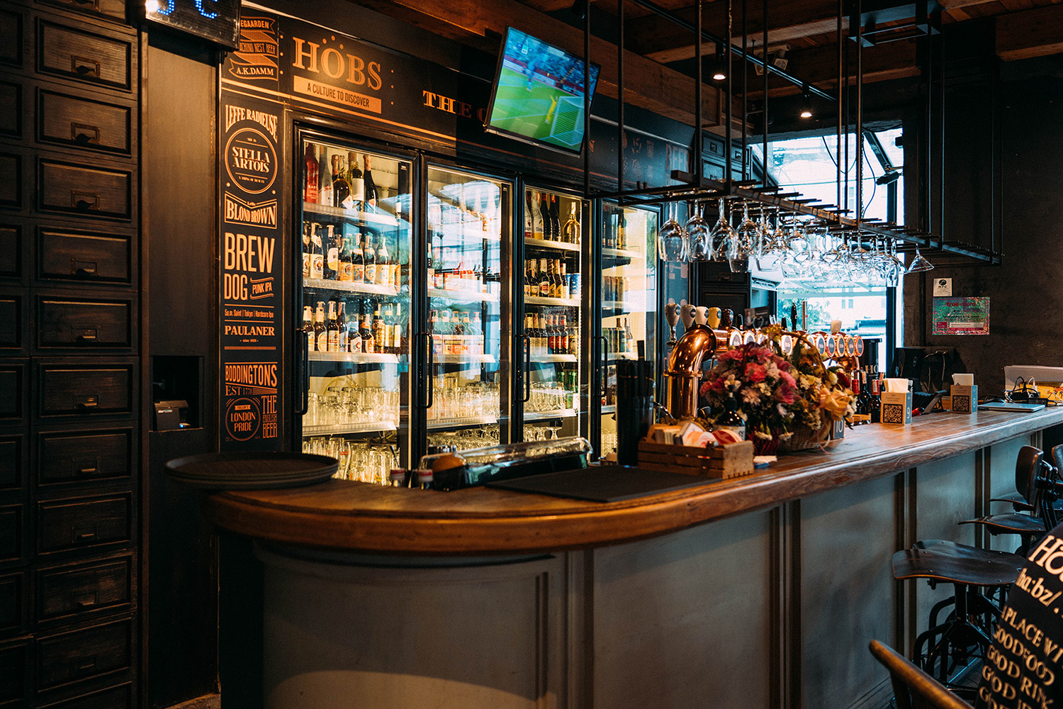 “Hobs” สาขาทองหล่อ ซึ่งคุ้นเคยกันดีว่าเป็นหนึ่งในธุรกิจในเครือของ “จี๊บ – เทพอาจ กวินอนันต์” ร้านตั้งอยู่ที่ ทองหล่อปากซอย 16 การตกแต่งภายในร้านเป็นงานดีไซน์ใช้เหล็กและงานไม้มาเป็นโครงสร้างหลัก ผ่านงานท่อเบียร์ดัดอย่างเป็นสไตล์ ที่บ่งบอกอัตลักษณ์ของ Hobs บวกกับการเลือกใช้สีและเฟอร์นิเจอร์ที่มีดีไซน์แตกต่างไม่ซ้ำกัน ให้ความรู้สึกเหมือนการมีเพื่อนหลายสไตล์ แต่ยังสามารถรวมกลุ่มเข้ามาแฮงเอาต์กันได้ในที่แห่งนี้