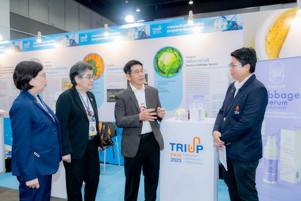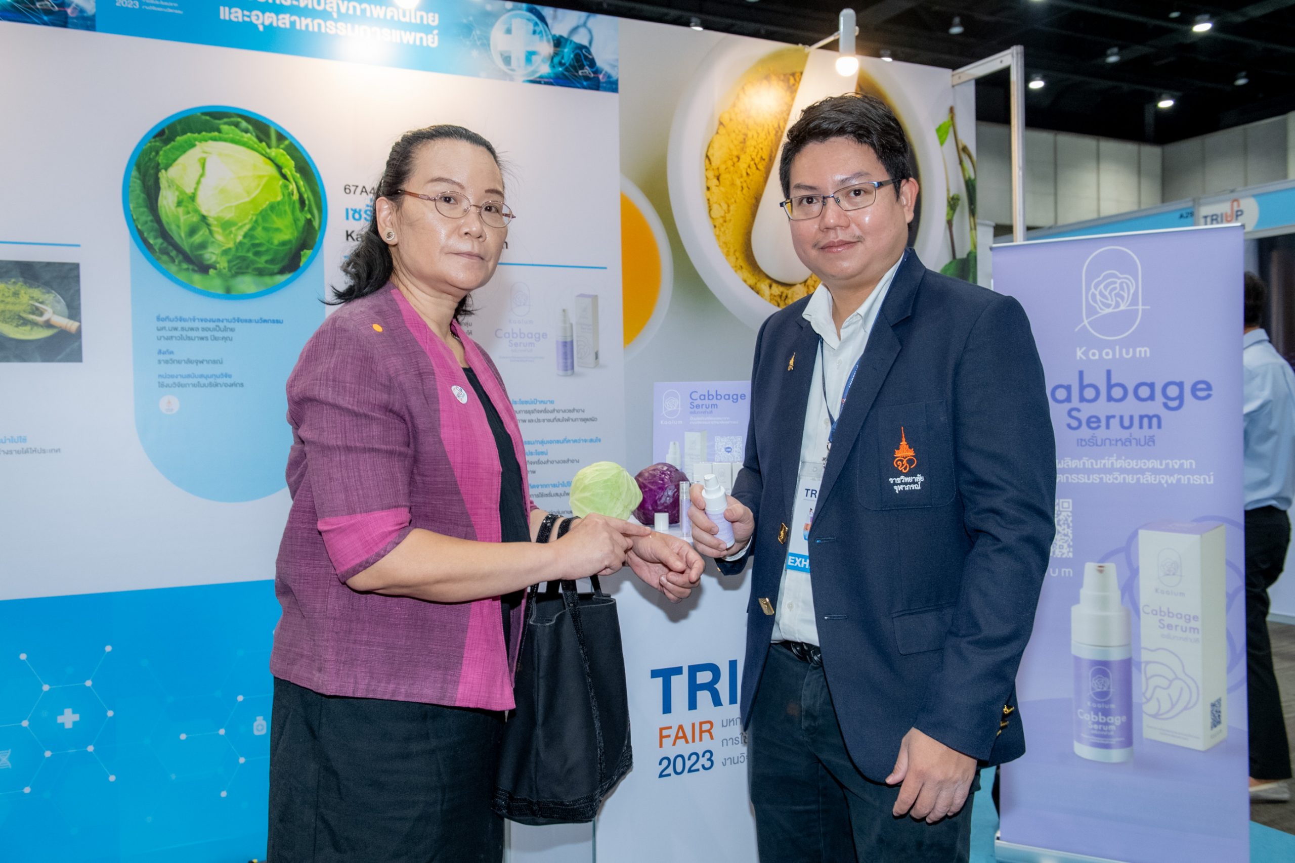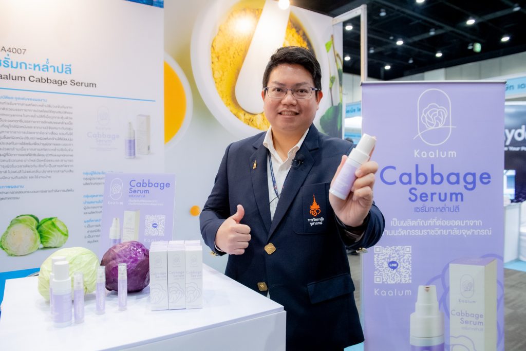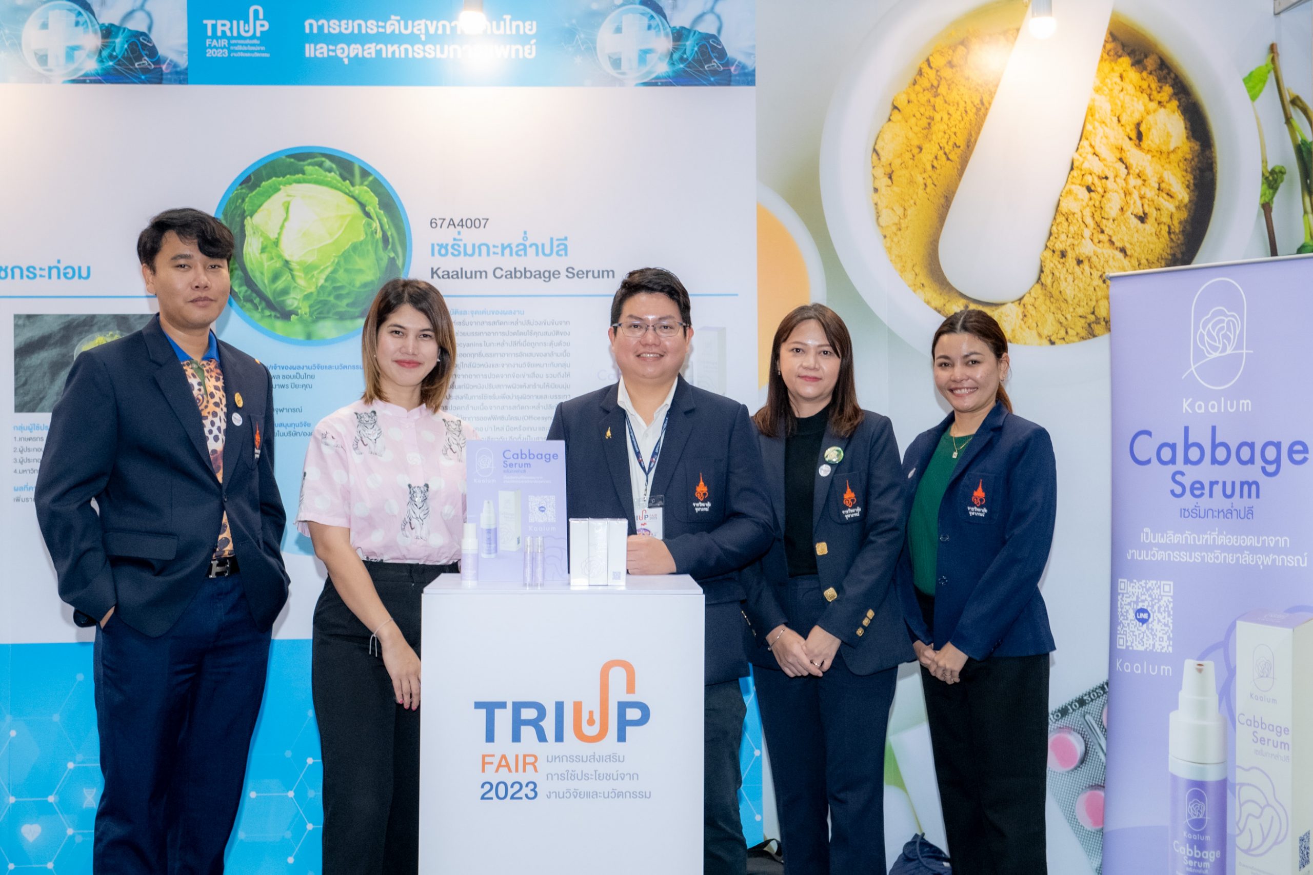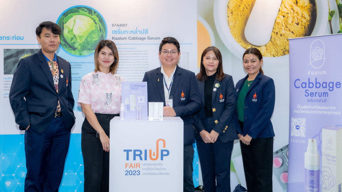 คุณสมบัติผลิตภัณฑ์ ผลิตภัณฑ์เซรั่มจากสารสกัดกะหล่ำปลีม่วงเข้มข้นจากธรรมชาติ ไม่แต่งสี ไม่แต่งกลิ่น ปราศจากสารกันเสีย ช่วยบรรเทาปวดโดยใช้คุณสมบัติของสาร Anthocyanins ในกะหล่ำปลีที่เมื่อถูกกระตุ้นด้วยความเย็นจะออกฤทธิ์บรรเทาอาการอักเสบของกล้ามเนื้อในระดับที่อยู่ใกล้ผิวหนังและจากงานวิจัยเหมาะกับกลุ่มผู้มีปัญหาจากอาการข้อเข่าเสื่อม รวมถึงให้ความชุ่มชื้นแก่ผิวหนัง ปรับสภาพผิวแห้งกร้านให้เนียนนุ่ม สรรพคุณ มีคุณสมบัติลดอาการอักเสบและบรรเทาอาการปวดเมื่อยกล้ามเนื้อ (จากงานวิจัย) อีกทั้งช่วยบำรุงผิวให้ชุ่มชื้น ท้ายสุดการเข้าร่วมงาน TRIUP FAIR 2023 มหกรรมส่งเสริมการใช้ประโยชน์จากงานวิจัย และนวัตกรรม ได้รับความสนใจอย่างมาก ตรงกับวัตถุประสงค์ เพื่อโอกาสในการขยายผลงานวิจัยและนวัตกรรมเพื่อให้เกิดประโยชน์ในเชิงพาณิชย์ ตลอดจนสร้างเครือข่ายร่วมกับหน่วยงานในระบบนิเวศส่งเสริมการใช้ประโยชน์ผลงานวิจัยและนวัตกรรม
