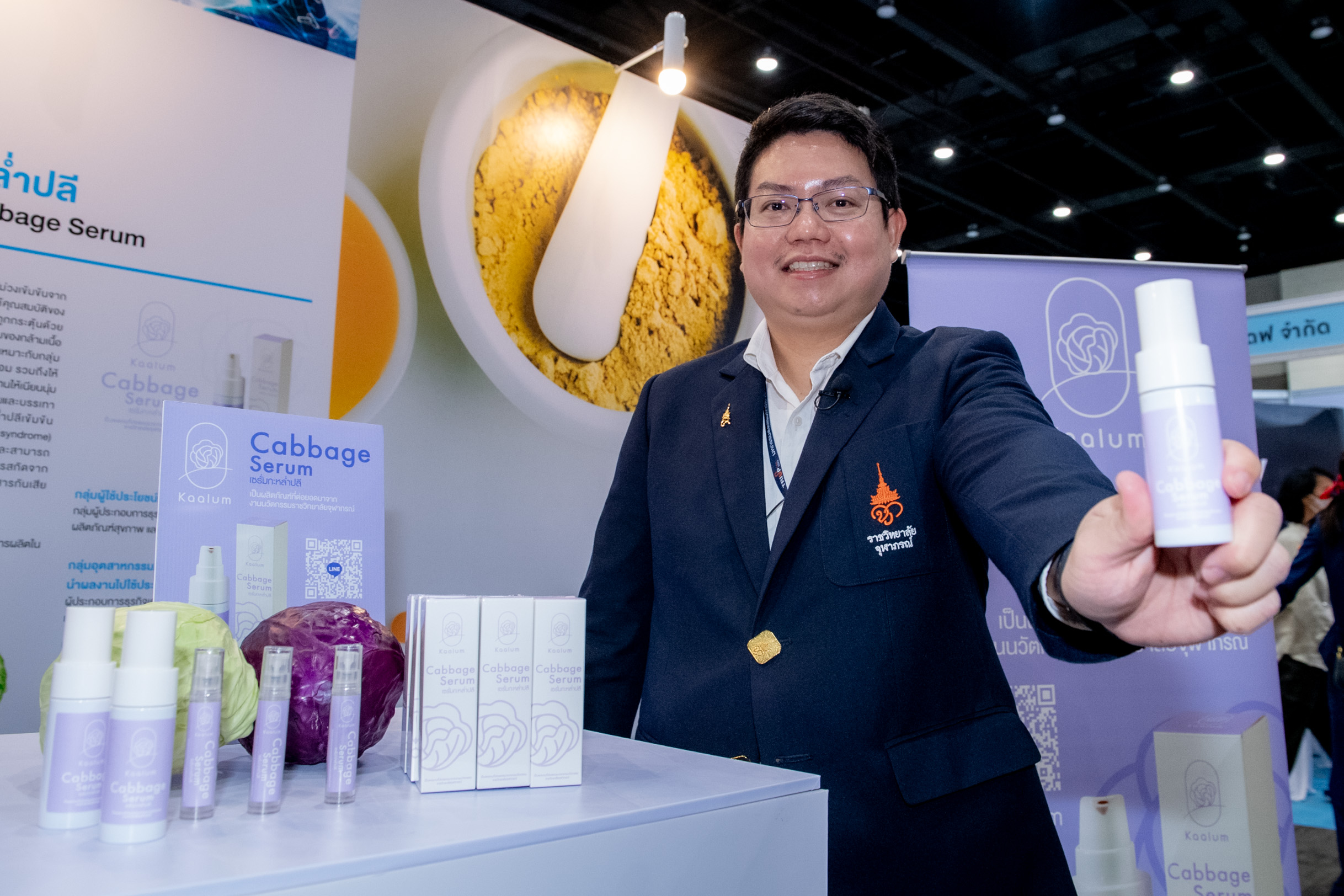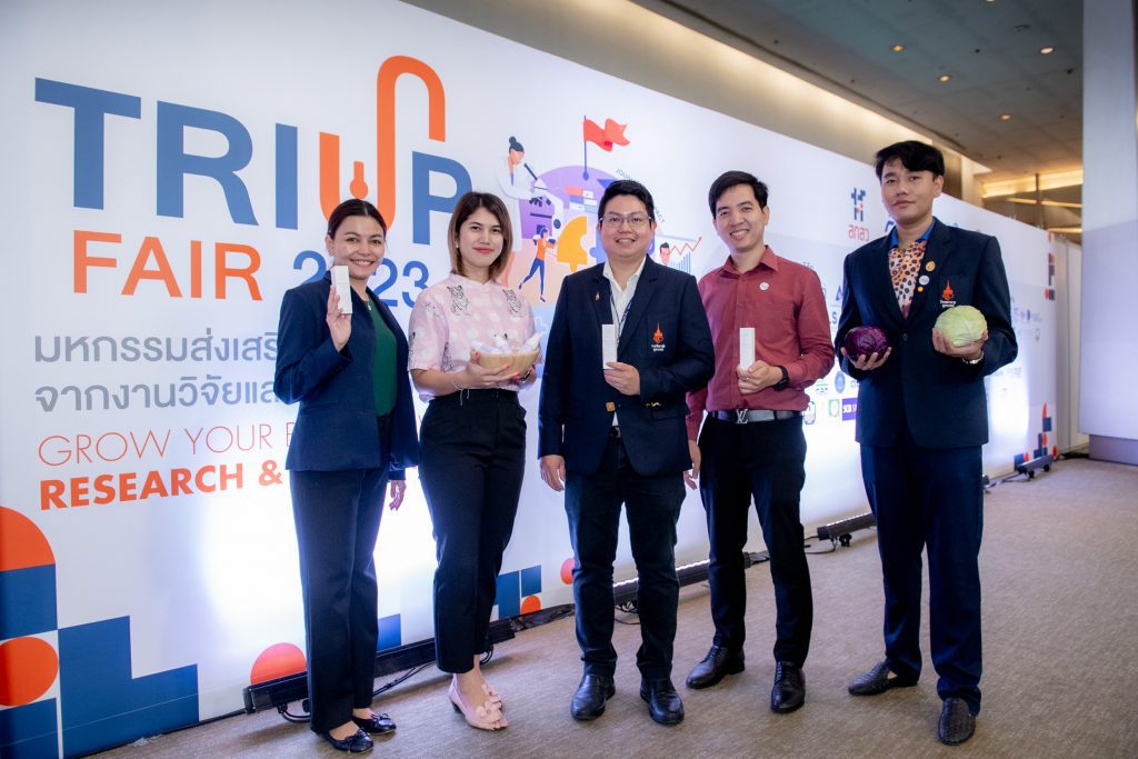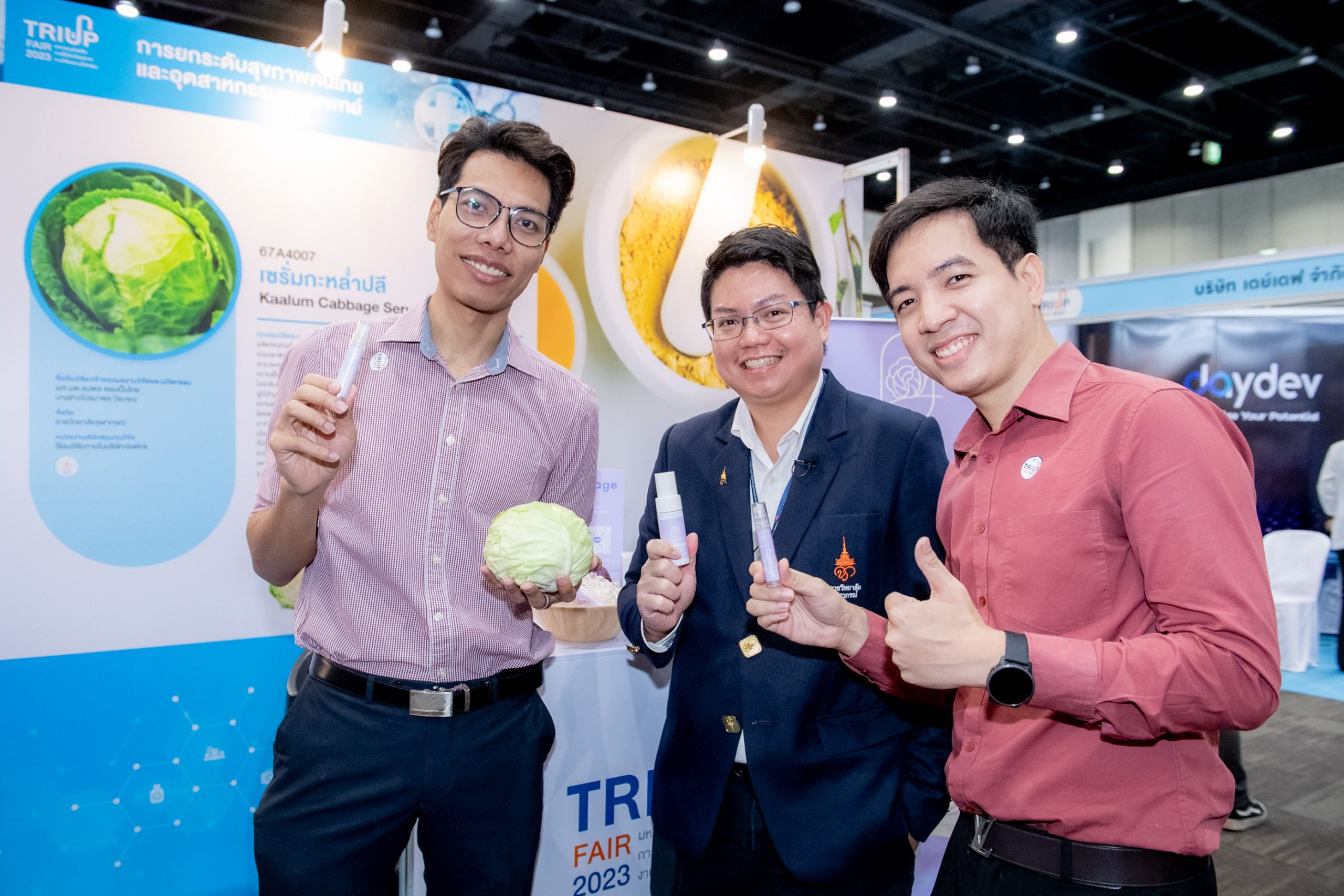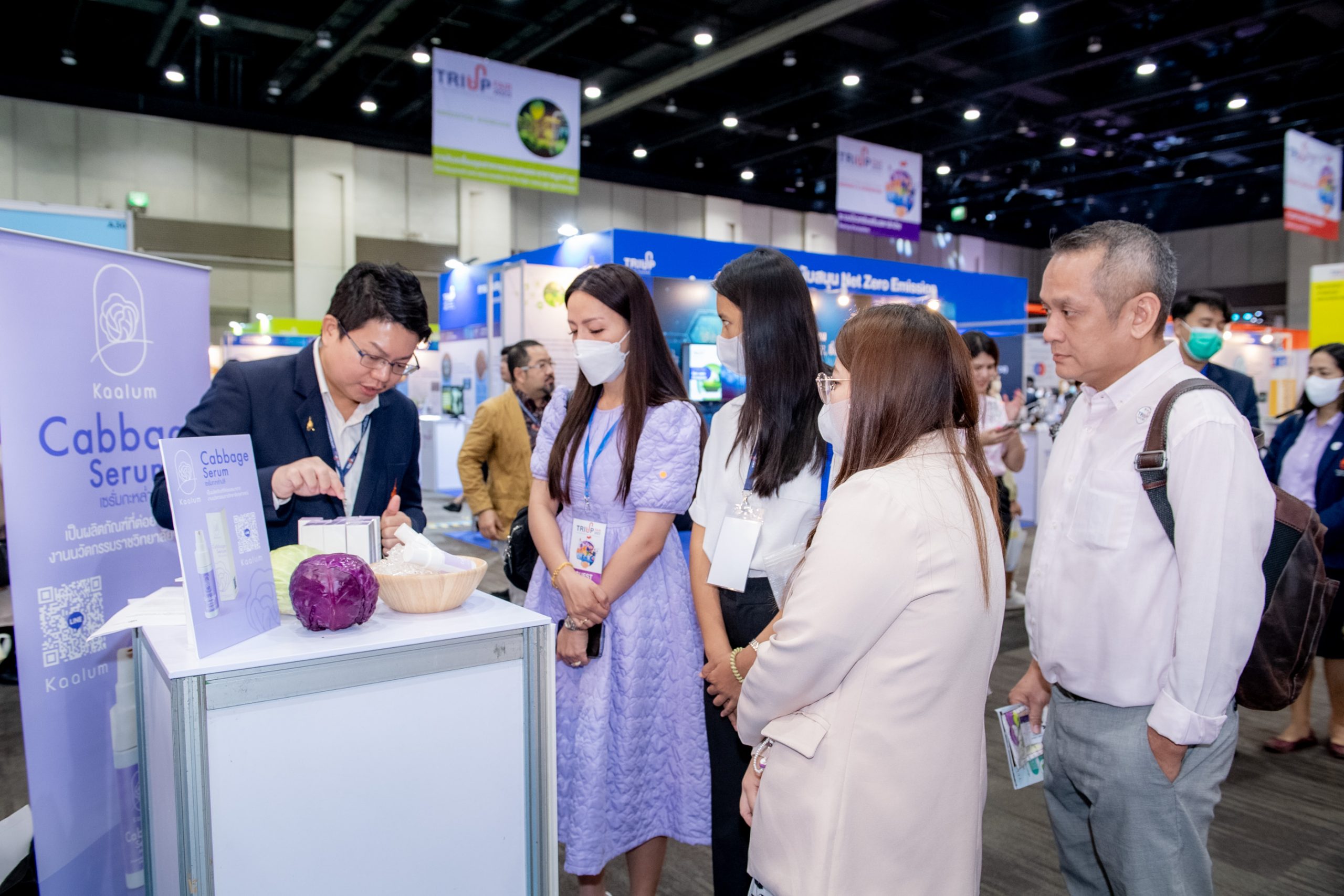 คุณสมบัติผลิตภัณฑ์ ผลิตภัณฑ์เซรั่มจากสารสกัดกะหล่ำปลีม่วงเข้มข้นจากธรรมชาติ ไม่แต่งสี ไม่แต่งกลิ่น ปราศจากสารกันเสีย ช่วยบรรเทาปวดโดยใช้คุณสมบัติของสาร Anthocyanins ในกะหล่ำปลีที่เมื่อถูกกระตุ้นด้วยความเย็นจะออกฤทธิ์บรรเทาอาการอักเสบของกล้ามเนื้อในระดับที่อยู่ใกล้ผิวหนังและจากงานวิจัยเหมาะกับกลุ่มผู้มีปัญหาจากอาการข้อเข่าเสื่อม รวมถึงให้ความชุ่มชื้นแก่ผิวหนัง ปรับสภาพผิวแห้งกร้านให้เนียนนุ่ม สรรพคุณ มีคุณสมบัติลดอาการอักเสบและบรรเทาอาการปวดเมื่อยกล้ามเนื้อ (จากงานวิจัย) อีกทั้งช่วยบำรุงผิวให้ชุ่มชื้น ท้ายสุดการเข้าร่วมงาน TRIUP FAIR 2023 มหกรรมส่งเสริมการใช้ประโยชน์จากงานวิจัย และนวัตกรรม ได้รับความสนใจอย่างมาก ตรงกับวัตถุประสงค์ เพื่อโอกาสในการขยายผลงานวิจัยและนวัตกรรมเพื่อให้เกิดประโยชน์ในเชิงพาณิชย์ ตลอดจนสร้างเครือข่ายร่วมกับหน่วยงานในระบบนิเวศส่งเสริมการใช้ประโยชน์ผลงานวิจัยและนวัตกรรม